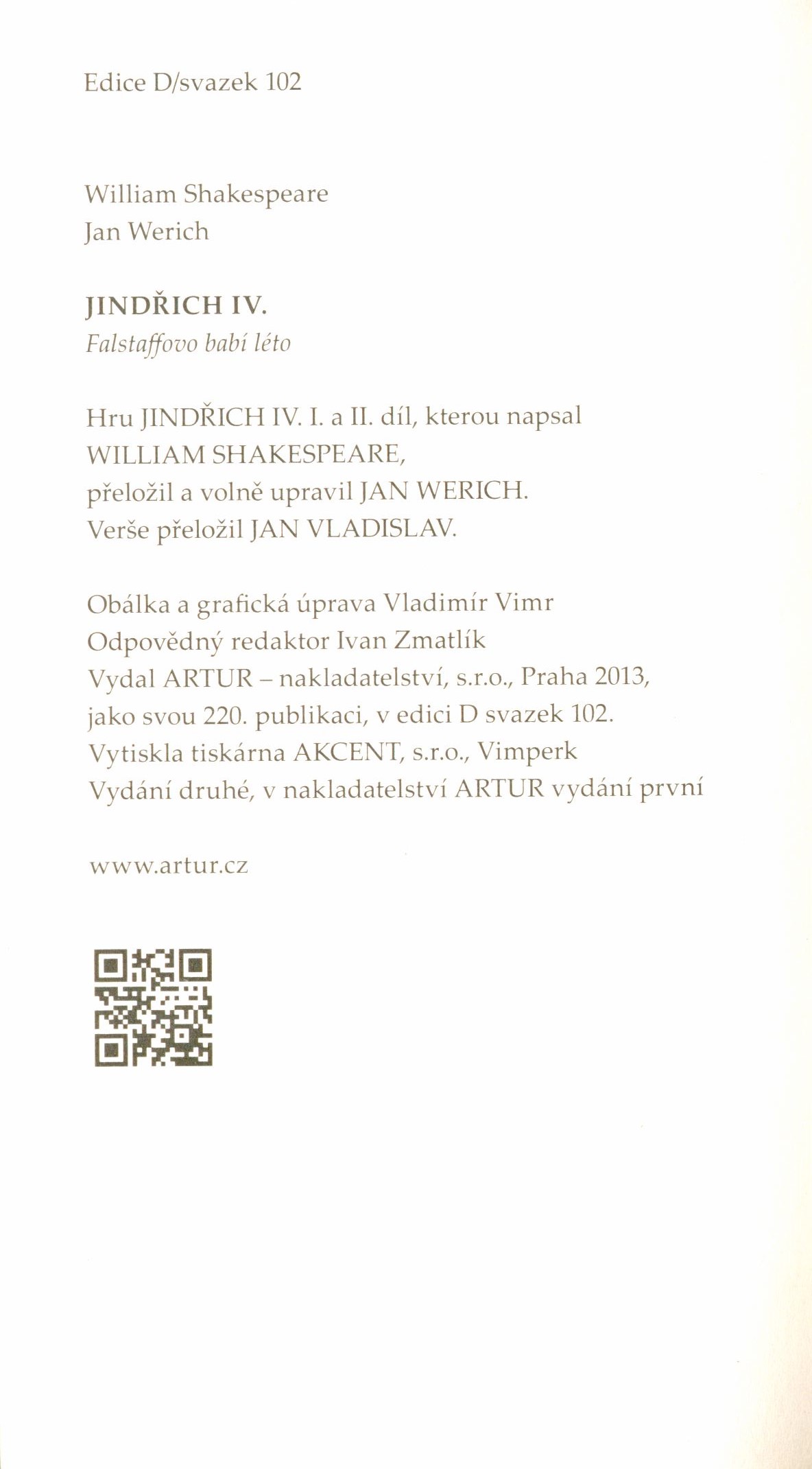 1. Title informationJindřich IV. : Falstaffovo babí léto / William Shakespeare ; přeložil a volně upravil Jan Werich ; verše přeložil Jan Vladislav ; obálka a grafická úprava Vladimír Vimr