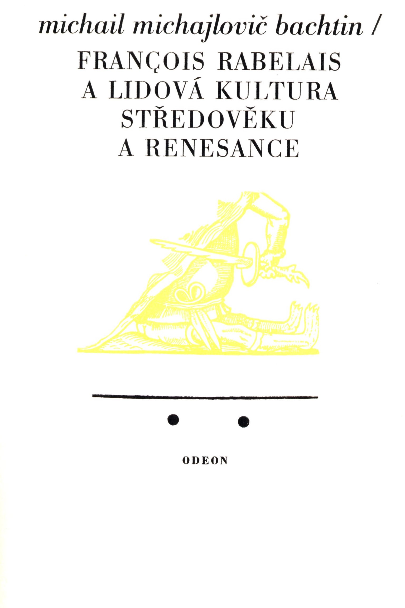 Title information François Rabelais a lidová kultura středověku a renesance / Michail Michajlovič Bachtin ; přeložil, obrazovou přílohu uspořádal a doslov napsal Jaroslav Kolár ; graficky upravil, obálku a vazbu navrhl Libor Fára Personal name Bachtin, Michail Michajlovič, 1895-1975 (Author) Další autoři Kolár, Jaroslav, 1929-2013 (Translator) (Author of afterword, colophon, etc.) Fára, Libor, 1925-1988 (Book designer) (Bookjacket designer) Corporation Odeon (nakladatelství) (Publisher) Tisk Brno (tiskárna) (Printer) Edition statement vydání první Publication Praha : Odeon, 1975 Manufacture Brno : Tisk Scope 406 stran, 48 nečíslovaných stran obrazových příloh : ilustrace (některé barevné), faksimile ; 22 cm ISBN (Vázáno) Country Czech Republic Language Czech Language of the original Russian Note Barevná zdobená obálka. - Oranžová plátěná vazba s ražbou. - Zdobená přídeští. - Frontispis. - Ilustrovaný titulní list. - Ilustrace. - Rejstřík jmen a anonymních děl. - 2 000 výtisků.