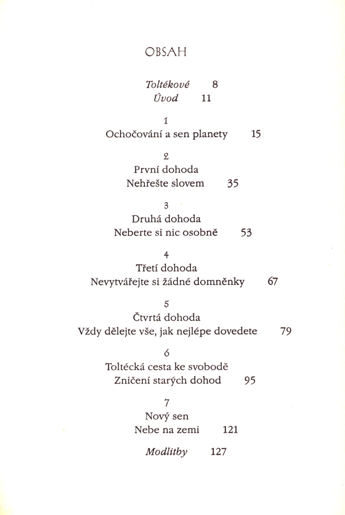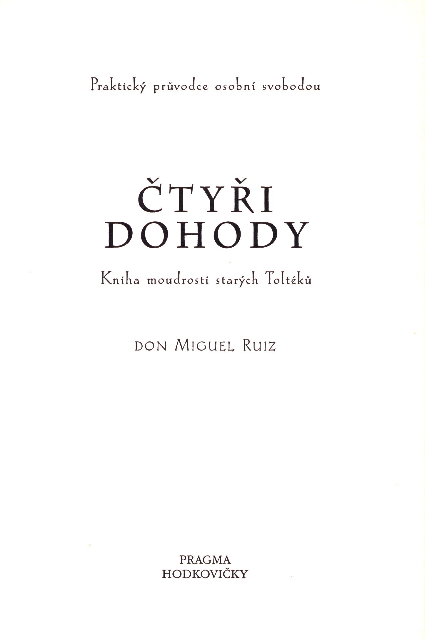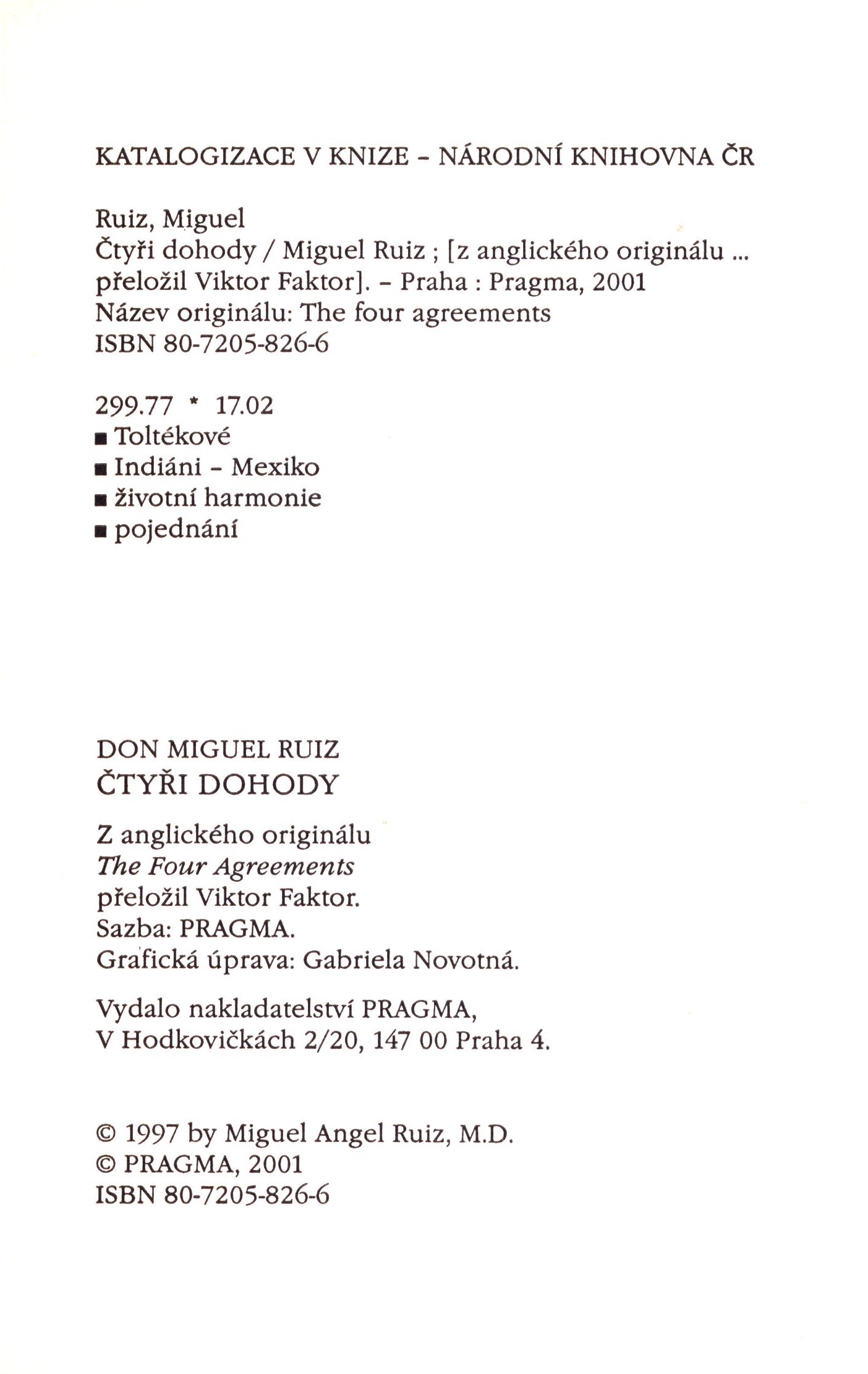 Title information Čtyři dohody : kniha moudrosti starých Toltéků : praktický průvodce osobní svobodou / Miguel Ruiz ; z anglického originálu The Four Agreements přeložil Viktor Faktor ; grafická úprava Gabriela Novotná Personal name Ruiz, Miguel, 1952- (Author) Další autoři Faktor, Viktor, 1944-2017 (Translator) Novotná, Gabriela (Book designer) Corporation Pragma (nakladatelství) (Publisher) Publication Hodkovičky [Praha] : Pragma, [2001] Copyright notice date ©2001 Scope 135 stran ; 20 cm ISBN 80-7205-826-6 (vázáno) Country Czech Republic Language Czech Language of the original English Note Barvná zdobená obálka. - Na přední záložce obálky anotace, na zadní záložce bio-bibliografická poznámka o autorovi. - Část nákladu (dotisk?) jen 134 s. (text ze s. 135 přesunut na s. 134).