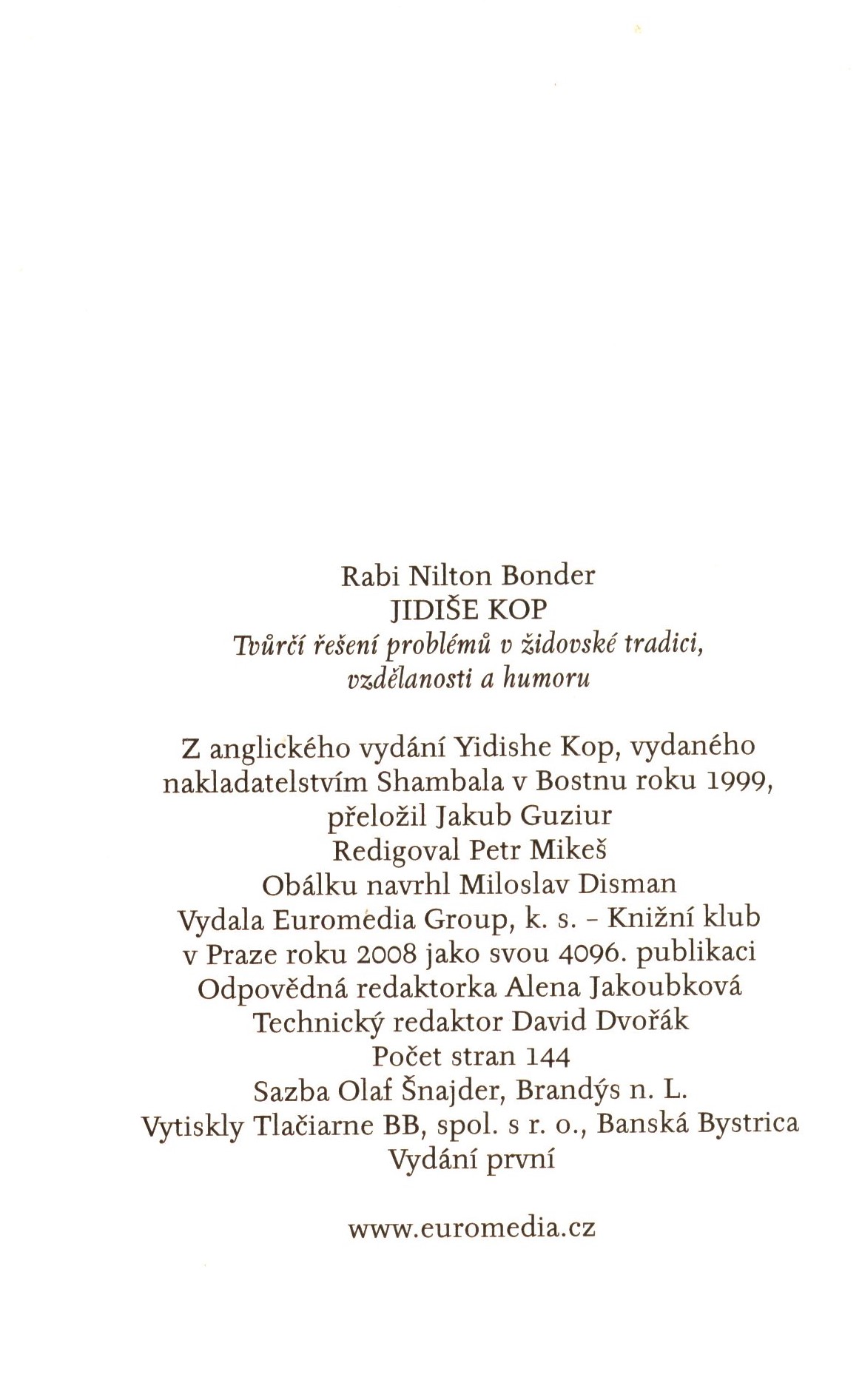 Title information Jidiše kop : tvůrčí řešení problémů v židovské tradici, vzdělanosti a humoru / Nilton Bonder ; přeložil Jakub Guziur ; obálku navrhl Miloslav Disman Personal name Bonder, Nilton, 1957- (Author) Další autoři Guziur, Jakub, 1978- (Translator) Disman, Miloslav, 1947- (Bookjacket designer) Corporation Euromedia Group - Knižní klub (nakladatelství) (Publisher) Tlačiareň BB (tiskárna) (Printer) Edition statement Vydání první Publication V Praze : Knižní klub, 2008 Manufacture Banská Bystrica : Tlačiareň BB Scope 143 stran ; 18 cm ISBN 978-80-242-2010-9 (vázáno) Country Czech Republic Language Czech Language of the original English Note Barevná zdobená obálka. - Na přední záložce onblky anotace, na zadní záložce biografická poznámka o autorovi. - Redakční poznámka. - Přeloženo z angličtiny.