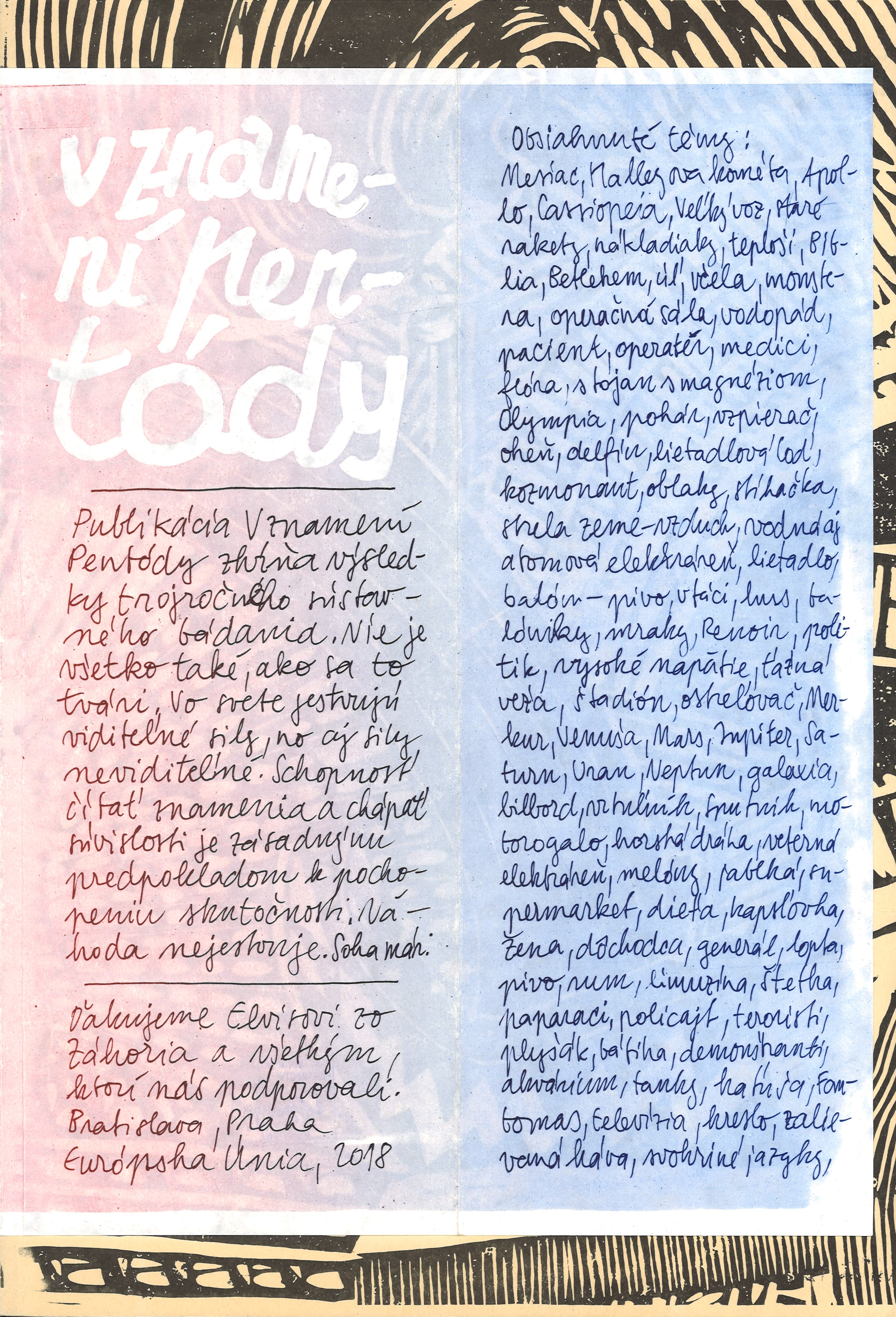 Poznámka o dalších původcích Název převzatý z knihy Znamení pentody H.W. Harmattana (Josefa Kuchyňky) a W.E. Westerna (Václava Havránka), 1937. Autorské tisky vykopíroval a originál litografie vytiskl Jaroslav Janďourek (tiskárna UMPRUM Praha), svázali Jan Hybner a Vladimíra Šturmová (knihvazačská dílna UMPRUm Praha). Annotation Autorská publikace V znamení Pentódy představuje fragmenty rozřezaného velkoplošného linorytu, na kterém po dobu tří let spolupracovali Jan Čumlivski, Palo Čejka a Tomáš Klepoch. Je originálním uměleckým projektem svázaným a vsazeným do expresivního ručně popsaného obalu. Document kind monografie Source description note Všechny údaje k popisu získané z přihlášky do soutěže NČKR 2018. Keywords česká literatura * autorská kniha * ilustrovaný příběh * detektivní příběh * linoryt * Nejkrásnější české knihy * r. 2018 UDC 821.162.3 Uživatelské pole PNP Nejkrásnější české knihy 2018 - Bibliofilie a autorské knihy, 1. místo; Cena Ministerstva kultury ČR. Call number Track No. Location Info NK/18 062 1261/2023 Sbírka