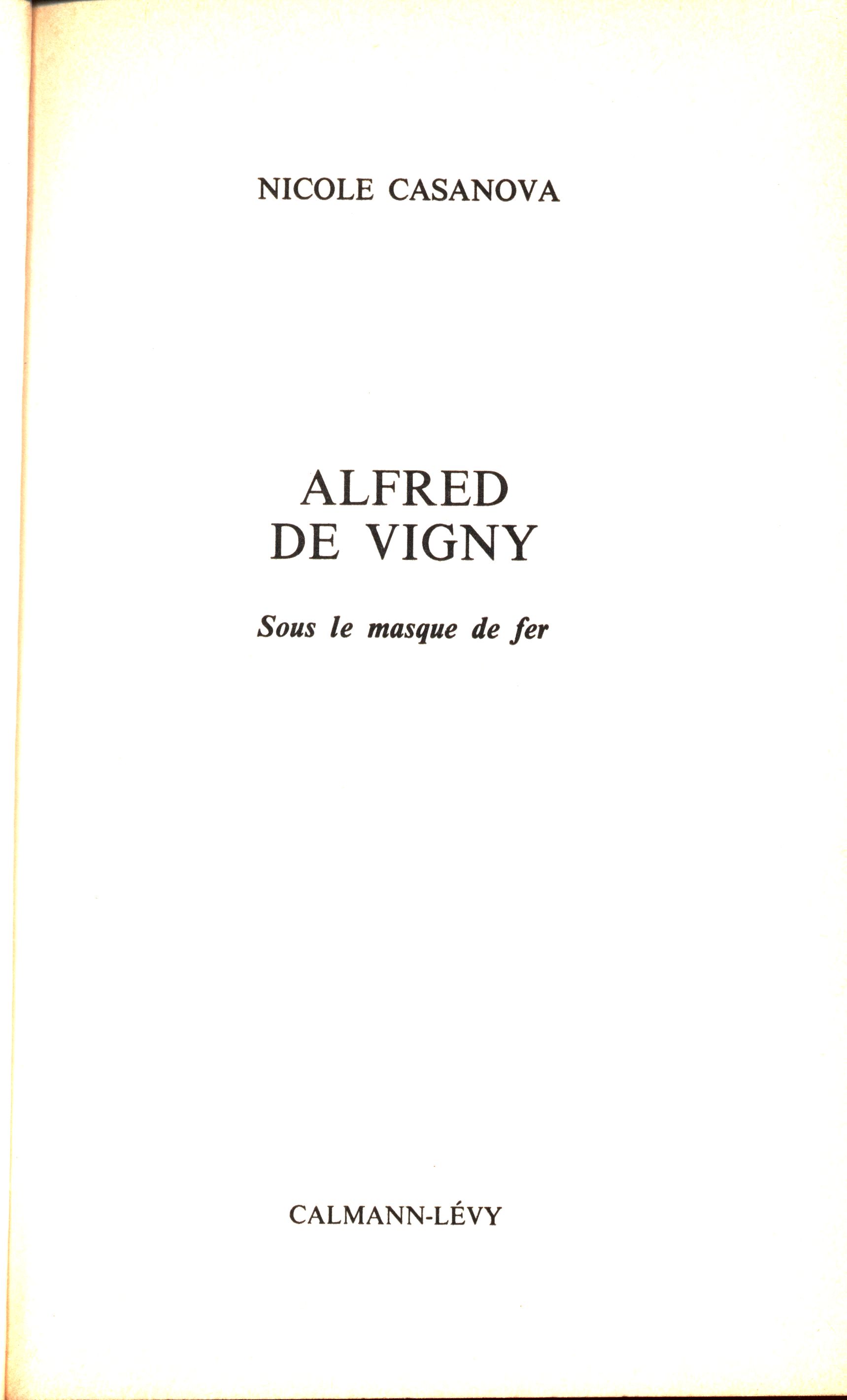 Title information Alfred de Vigny : Sous le masque de fer / Nicole Casanova Personal name Casanova, Nicole, (Author) 1934- Další autoři Firmin-Didot (firma) (Printer) Calmann-Lévy (firma) (Publisher) Publication Paris : Calmann-Lévy, 1990 Manufacture Mesnil : Firmin-Didot et Cie Scope 334 stran, 8 nečíslovaných listů obrazové přílohy : ilustrace ; 24 cm ISBN 2-7021-1852-6 (brožováno) Edition Biographie