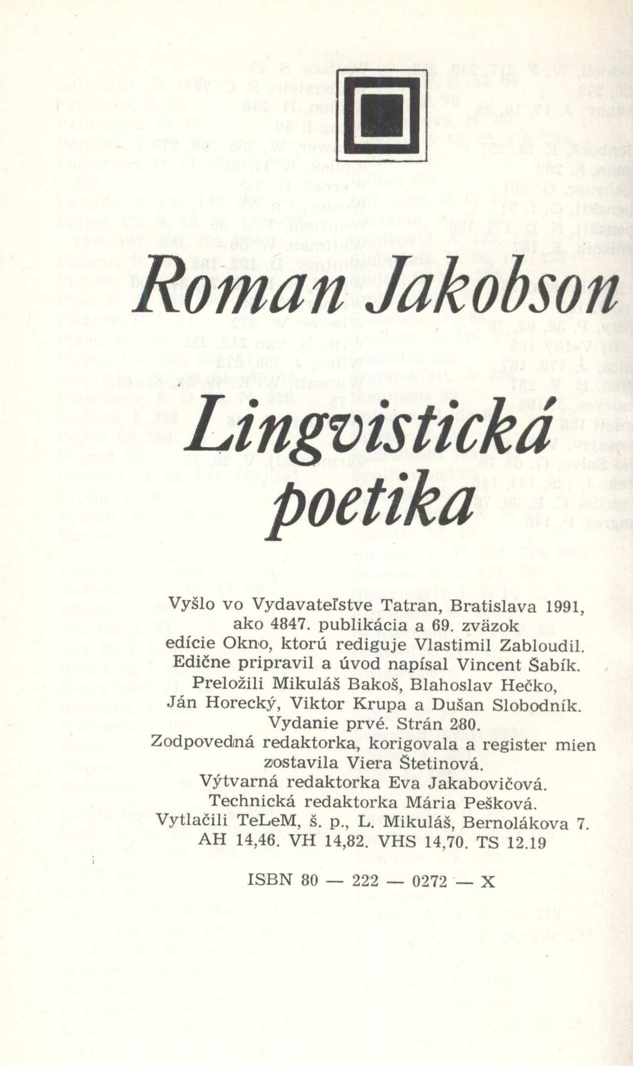 Okno, (Tatran)Country Slovakia Language Slovak Language of the original Russian Note Zdobená barevná obálka. - Zdobená plátěná vazba. - Na přední záložce obálky anotace, na zadní záložce nakladatelská inzerce. - Obsah. - Ediční poznámka. - Úvod.