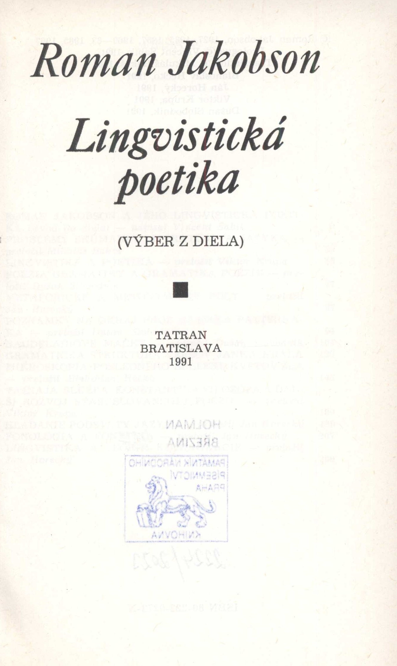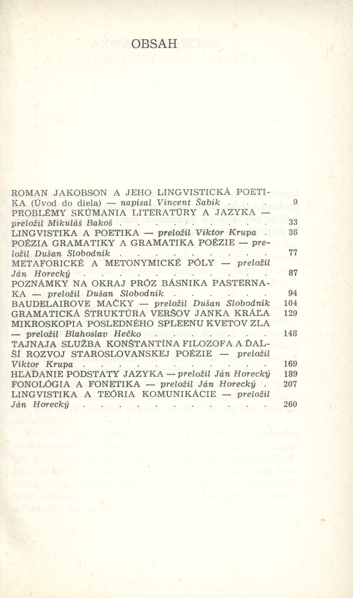Title information Lingvistická poetika : (výber z diela) / Roman Jakobson ; edične pripravil a úvod napísal Vincent Šabík ; preložili Mikuláš Bakoš, Blahoslav Hečko, Ján Horecký, Viktor Krupa a Dušan Slobodník Personal name Jakobson, Roman, 1896-1982 (Author) Další autoři Šabík, Vincent, 1937- (Editor) (Author of introduction) Bakoš, Mikuláš, 1914-1972 (Translator) Hečko, Blahoslav, 1915- (Translator) Horecký, Ján, 1920-2006 (Translator) Krupa, Viktor, 1936-2021 (Translator) Slobodník, Dušan, 1927-2001 (Translator) Corporation Vydavateľstvo Tatran (Publisher) TeLeM (tiskárna) (Printer) Edition statement Vydanie prvé Publication Bratislava : Tatran, 1991 Manufacture L. Mikuláš : TeLeM, š.p. Scope 278 stran ; 20 cm ISBN 80-222-0272-X (vázáno) Edition Okno ; 69. zväzok