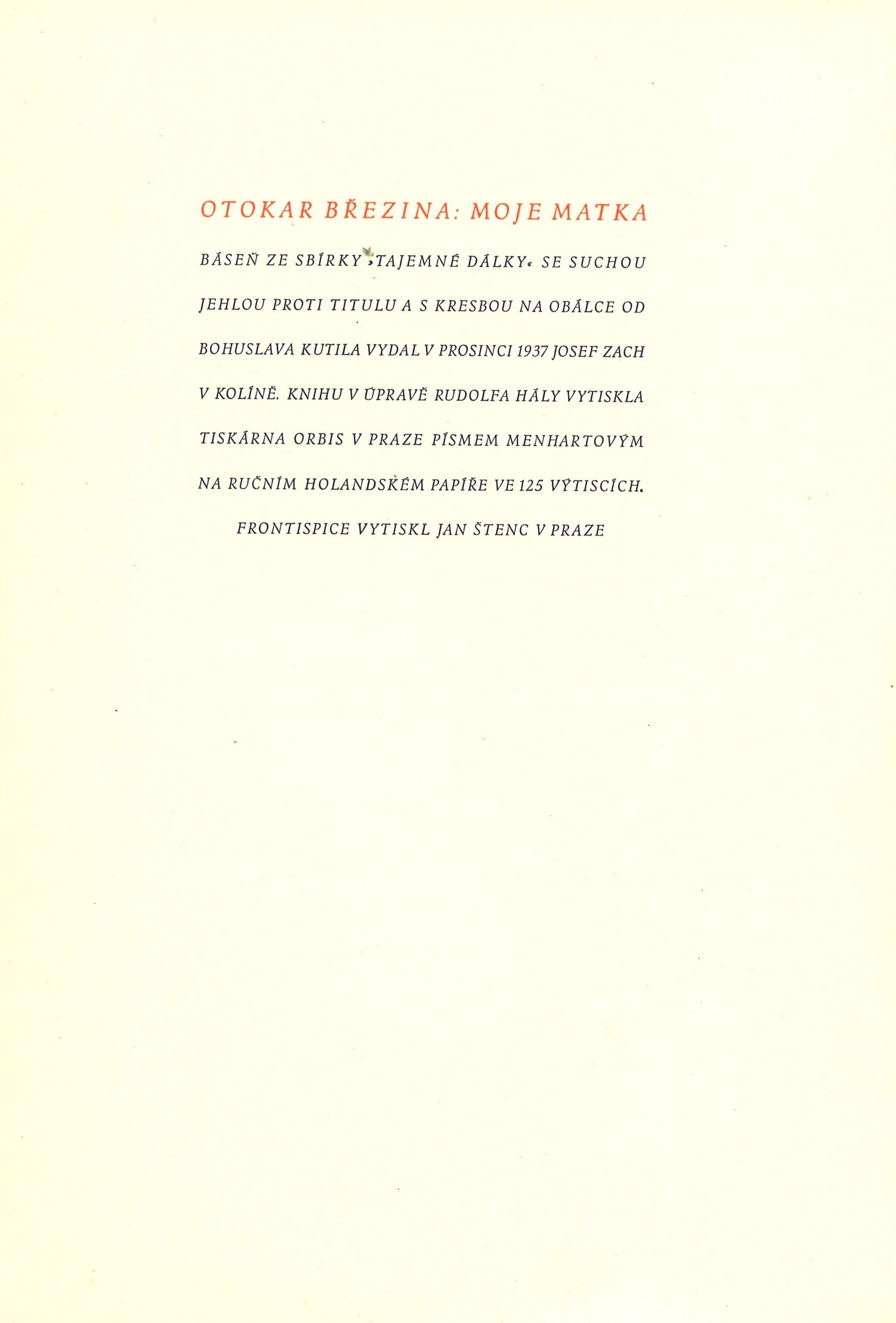 Názvové údaje Moje matka : báseň ze sbírky "Tajemné dálky" / Otokar Březina ; se suchou jehlou proti titulu a s kresbou na obálce od Bohuslava Kutila Osobní jméno Březina, Otokar, 1868-1929 (Autor) Další autoři Kutil, Bohuslav, 1907-1982 (Ilustrátor) (Autor podpisu) Hála, Rudolf, 1892-1968 (Knižní grafik) Zach, František Josef (Nakladatel, vydavatel) Korp. Orbis (tiskárna) (Tiskař) Jan Štenc (nakladatelství, tiskárna) (Tiskař) Nakladatel Kolín : Josef Zach, 1937 Výrobce V Praze : Orbis Rozsah 3 nečíslované listy ; 28,5 cm ISBN (Brožováno) Země vyd. Česko Jazyk dok. čeština Poznámky Zdobená obálka. - Frontispis s podpisem Bohuslava Kutila. - Dvoubarevný text. - Vytištěno písmem Menhartovým na ručním holandském papíře ve 125 výtiscích. - Bibliofilie.