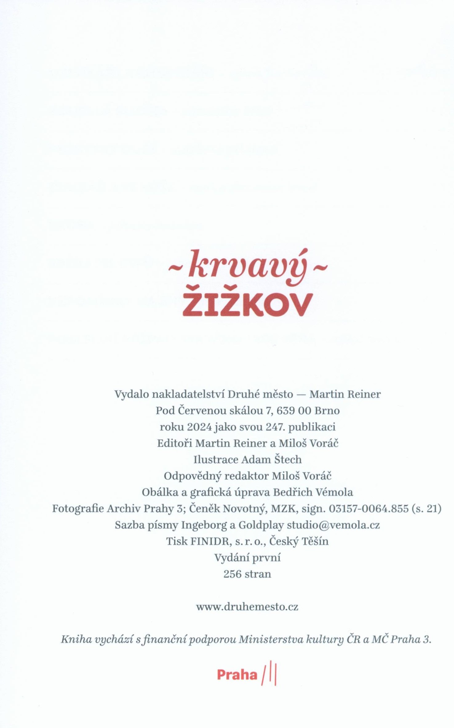 Title information Krvavý Žižkov / editoři Martin Reiner a Miloš Voráč ; ilustrace Adam Štech ; obálka a grafická úprava Bedřich Vémola Další autoři Reiner, Martin, 1964- (Editor) (Author of introduction) Voráč, Miloš, 1959- (Editor) (Author of introduction) Štech, Adam, 1980- (Illustrator) Vémola, Bedřich, 1970- (Bookjacket designer) (Book designer) Biler, Stanislav, 1982- (Author) Bohatá, Simona, 1965- (Author) Bolavá, Anna, 1981- (Author) Denemarková, Radka, 1968- (Author) Faulerová, Lucie, 1989- (Author) Fischerová, Sylva, 1963- (Author) Horáková, Pavla, 1974- (Author) Hůlová, Petra, 1979- (Author) Katalpa, Jakuba, 1979- (Author) Padevět, Jiří, 1966- (Author) Palán, Aleš, 1965- (Author) Pilátová, Markéta, 1973- (Author) Rudiš, Jaroslav, 1972- (Author) Urban, Miloš, 1967- (Author) Hájková, Eva, 1961- (Author) Corporation Druhé město (nakladatelství) (Publisher) Finidr (tiskárna) (Printer) Edition statement Vydání první Publication Brno : Druhé město, 2024 Manufacture Český Těšín : FINIDR, s.r.o. Scope 251 stran : ilustrace (některé barevné) ; 22 cm ISBN 978-80-7227-901-2 (vázáno) Country Czech Republic Language Czech Note Béžová obálka, černobílá ilustrace, červený text (i na hřbetu). - Červená vazba, béžový text (i na hřbetu). - Na přední záložce anotace knihy. - Na předsádkách mapky (plánky) Žižkova. - Rozložený titulní list (červený dvoulist, bílý text). - Úvod editorů. - Úvodní skica "Z historie města Žižkova" E. Hájková, barevné fotografie s popisky. - Jednotlivé povídky. - Barevné celostránkové ilustrace. - Na barevných listech "výstřižky" z černé kroniky. - Obsah. - N azadní straně obálky abecední seznam autorů povídek. - Přebal.