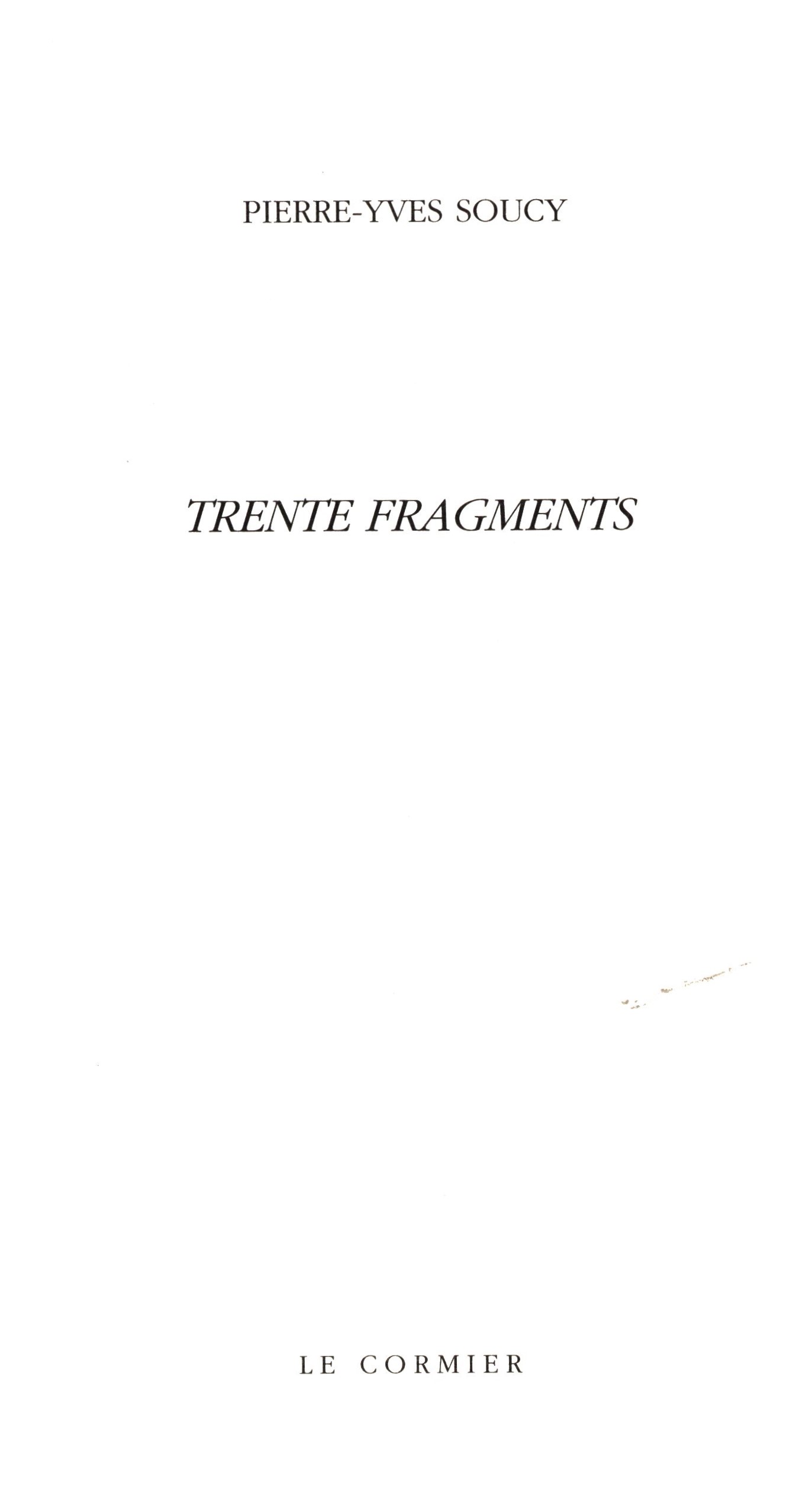 Title information Trente fragments / Pierre-Yves Soucy Personal name Soucy, Pierre-Yves, (Author) 1948- Další autoři Vladislav, Jan, 1923-2009 (Dedicatee) Corporation Le Cormier (nakladatelství) (Publisher) Publication [Bruxelles] : Cormier, [1994] Manufacture Courtrai : Groeninghe Scope 67 stran ; 22 cm ISBN (vázáno) Country Belgium Language French Note Dvoubarevný text na obálce. - Černobílý titulní list. - Částečně neořezané archy. - Básně číslovány římskými číslicemi. - Tiráž.
