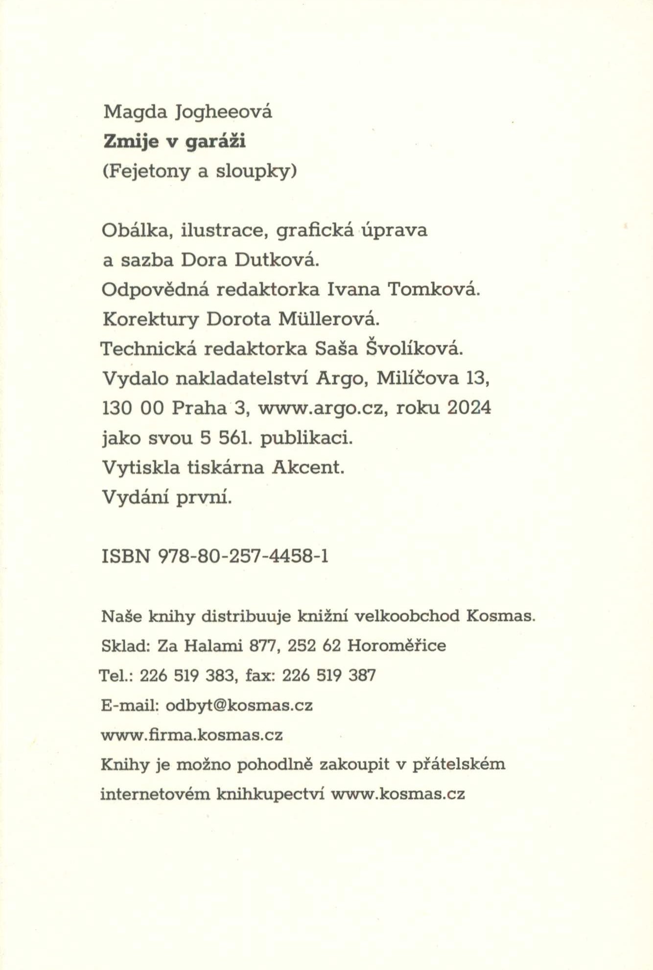 Title information Zmije v garáži : (fejetony a sloupky) / Magda Jogheeová ; obálka, ilustrace, grafická úprava a sazba Dora Dutková Personal name Jogheeová, Magda, 1953- (Author) Další autoři Dutková, Dora, 1980- (Bookjacket designer) (Illustrator) (Book designer) (Compositor) Křesťan, Rudolf, 1943- (Author of afterword, colophon, etc.) Corporation Argo (nakladatelství) (Publisher) Akcent tiskárna Vimperk (Printer) Edition statement Vydání první Publication Praha : Argo, 2024 Manufacture Akcent Scope 217 stran : ilustrace ; 19 cm ISBN 978-80-257-4458-1 (vázáno) Country Czech Republic Language Czech Note Zdobená barevná obálka a vazba. - Zelené předsádky. - Na přední záložce obálky anotace knihy, na zadní záložce poznámka o autorce. - Černobílé ilustrace převážně v textu, některé celostránkové. - Doslov (R. Křesťan). - Obsah. - Na zadní straně obálky úryvek z doslovu a nakladatelská upoutávka na další knihy autorky.