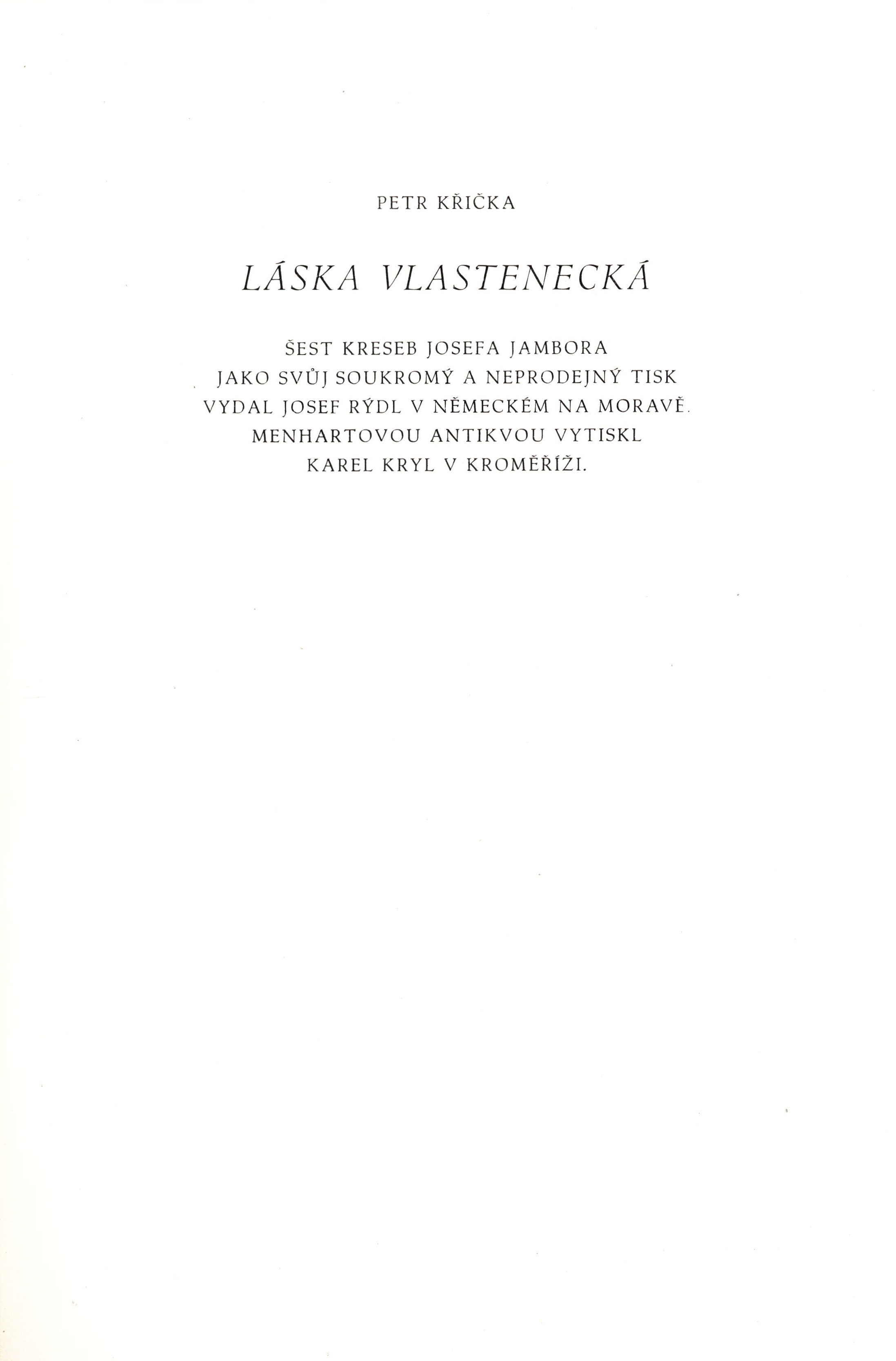 Názvové údaje Láska vlastenecká / Petr Křička ; šest kreseb Josefa Jambora Osobní jméno Křička, Petr, 1884-1949 (Autor) (Autor podpisu) (Dedikátor) Další autoři Jambor, Josef, 1887-1964 (Ilustrátor) (Autor podpisu) Rýdl, Josef (Dedikátor) (Nakladatel, vydavatel) Korp. Karel Kryl (firma: Kroměříž, Česko) (Tiskař) Nakladatel v Německém na Moravě : Josef Rýdl, [1949] Výrobce v Kroměříži : Karel Kryl Rozsah 7 volných dvojlistů : ilustrace ; 33 cm ISBN (volné listy) Země vyd. Česko Jazyk dok. čeština Poznámky Jednoduchá nezdobená obálka. - Volné dvojlisty v přebalu. - Ilustrace na frontispice. - Dvoubarevný titulní list. - Tiráž. - Celostránkové černobílé ilustrace.