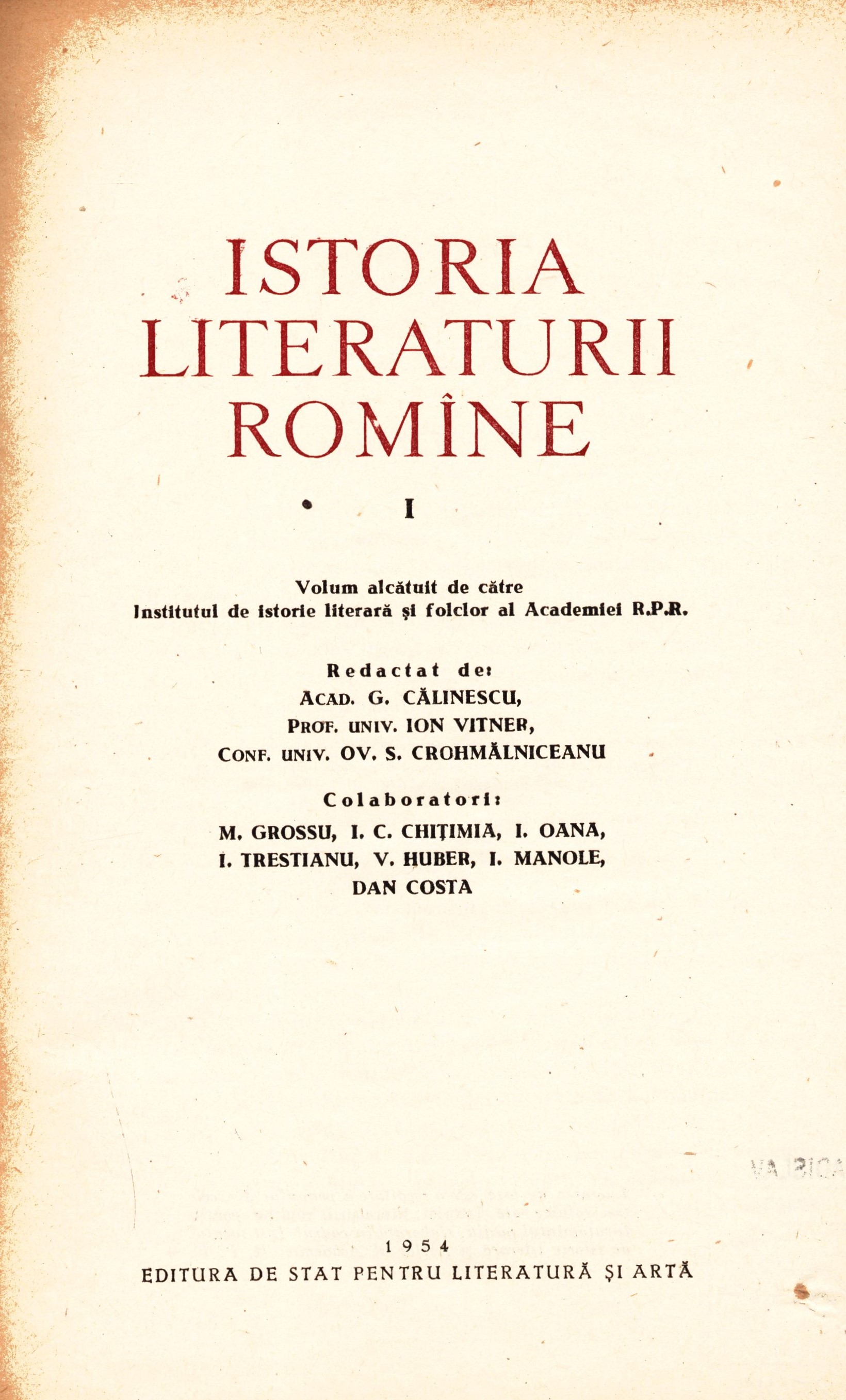 1. Title informationIstoria literaturii romîne. I / redactat de G. Călinescu ; prof. univ. Ion Vitner ; conf. univ. Ov. S. Crohmălniceanu