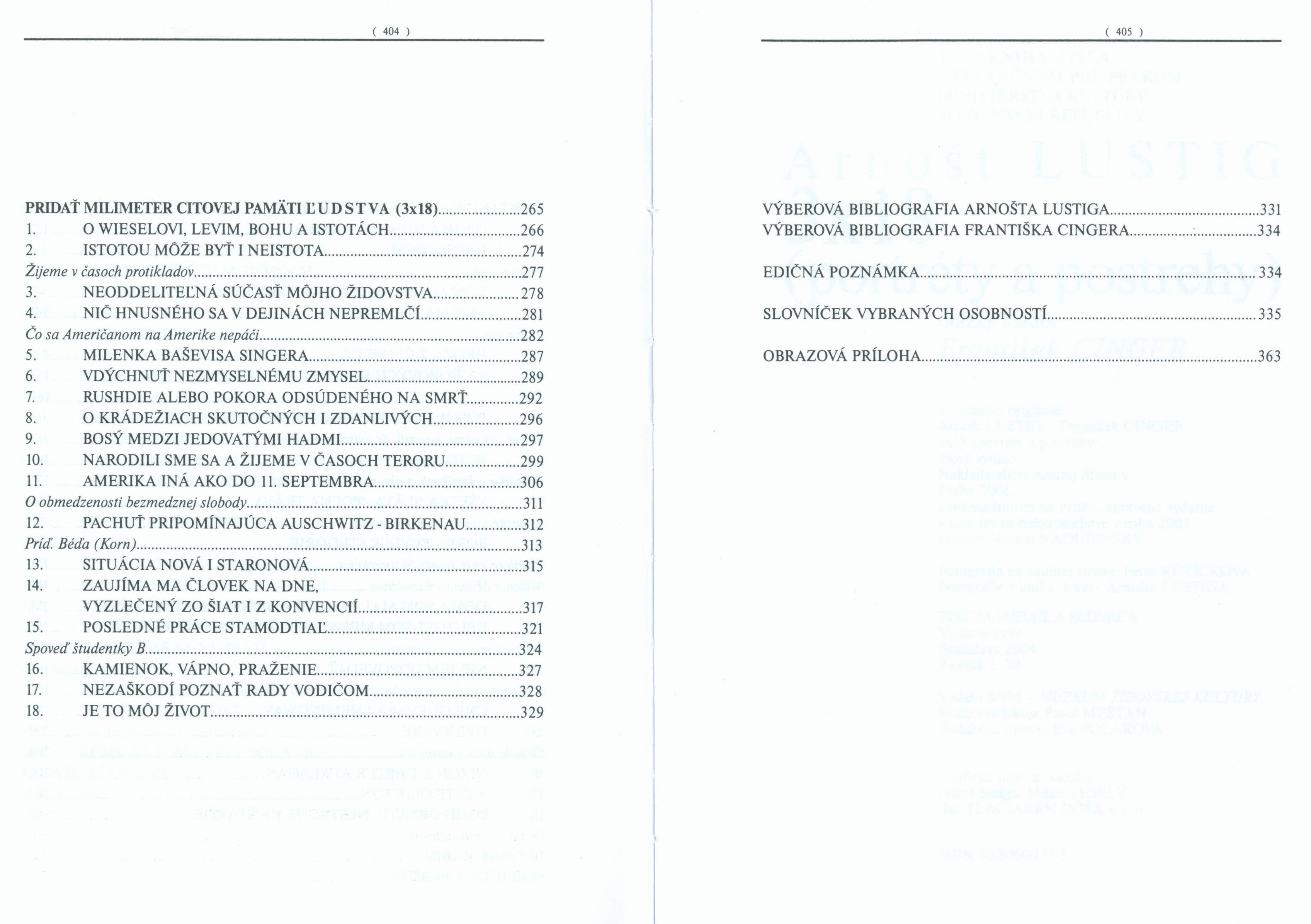 Judaica Slovaca (SNM - Múzeum židovskej kultúry)Country Slovakia Language Slovak Language of the original Czech Note Obálka s barevnou fotografií (koláž), dvoubarevný text (i na hřbetu). - Bílá vazba, černé faksimile podpisu, černý text na hřbetu. - Na přední záložce text A. Lustiga o F. Cingerovi, na zadní F. Cingera o A. Lustigovi. - Patitul. - Rozložený zdobený titulní list. - Úvod F. Cinger. - Faksimile ručně psaného poděkování A. Luštiga. - Ediční poznámka. - Slovníček vybraných osobností. - Obrazová příloha (černobílé fotografie s popisky). - Obsah. - Na zadní straně obálky barevná fotografická koláž a anonce knihy. - Přebal.