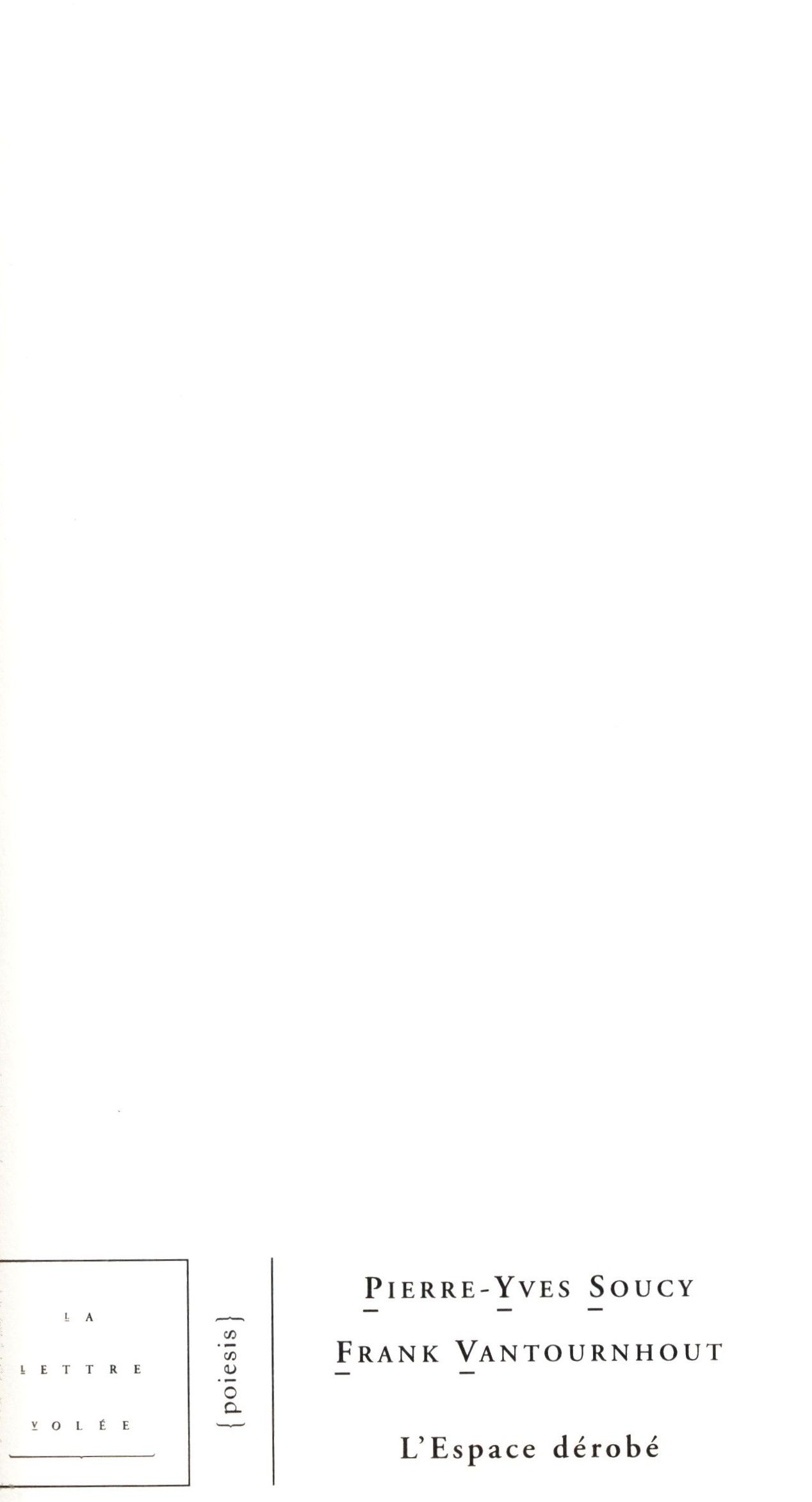 Title information L'espace dérobé / Pierre-Yves Soucy ; Frank Vantournhout Personal name Soucy, Pierre-Yves, 1948- (Author) Další autoři Vantournhout, Frank (Author) Vladislav, Jan, 1923-2009 (Dedicatee) Corporation Lettre volée (firma) (Publisher) Imprimerie Groeninghe (Printer) Publication Bruxelles : la Lettre Volée, 1997 Manufacture Courtrai : Groeninghe Scope 25 stran : ilustrace ; 21 cm ISBN 2-87317-065-4 (brožováno) Edition Poiesis ; 2