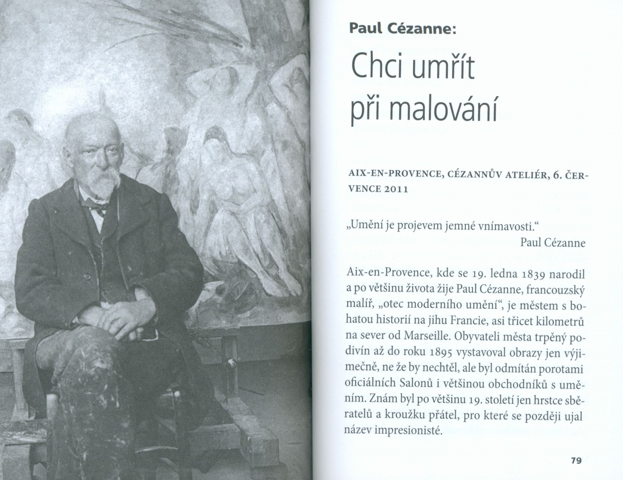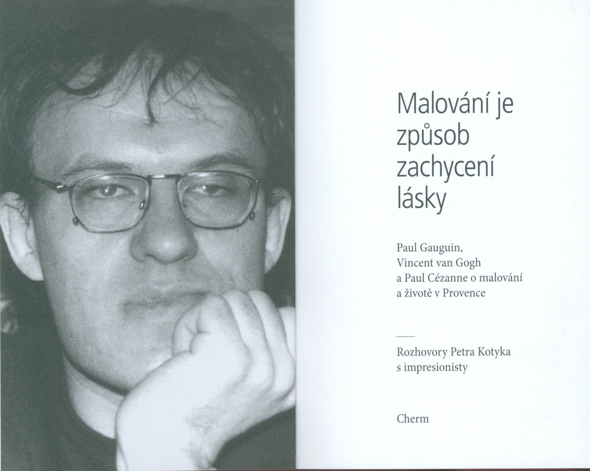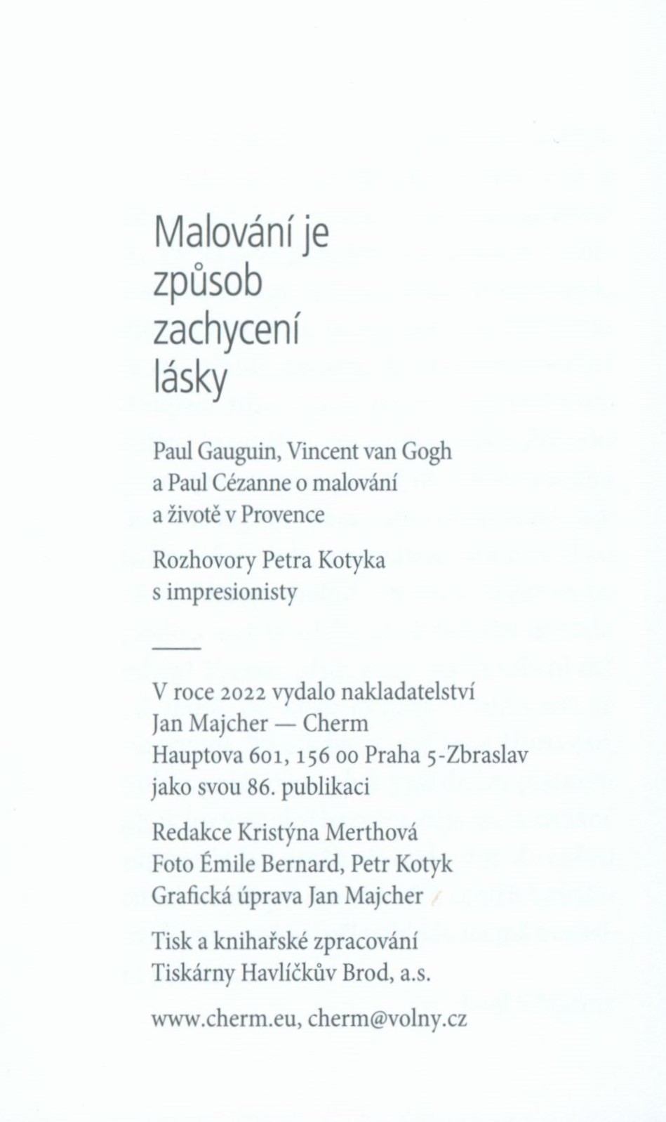 Title information Malování je způsob zachycení lásky : Paul Gauguin, Vincent van Gogh a Paul Cézanne o malování a životě v Provence / rozhovory Petra Kotyka s impresionisty ; foto Petr Kotyk, Émile Bernard ; grafická úprava Jan Majcher Personal name Kotyk, Petr, 1963- (Author) (Photographer) Další autoři Bernard, Émile, 1868-1941 (Photographer) Majcher, Jan, 1959- (Book designer) Corporation Cherm (nakladatelství) (Publisher) Tiskárny Havlíčkův Brod (firma) (Printer) Publication Praha : Cherm, 2022 Manufacture Havlíčkův Brod : Tiskárny Havlíčkův Brod, a.s. Scope 125 stran : ilustrace ; 15 cm ISBN 978-80-86370-75-0 (brožováno) Country Czech Republic Language Czech Note Žlutá obálka s dvoubarevným textem; černý hřbet s dvoubarevným textem. - Na přední záložce stručná biografie a bibliografie autora, na zadní text P. Cézanne. - Na vakátě černobílá ilustrace. - Patitul. - Frontispis (černobílé foto autora). - Poděkování. - Rozhovory. - Černobílé fotografie, reprodukce obrazů. - Ediční poznámka. - Obsah. - Na zadní straně obálky text o knize.