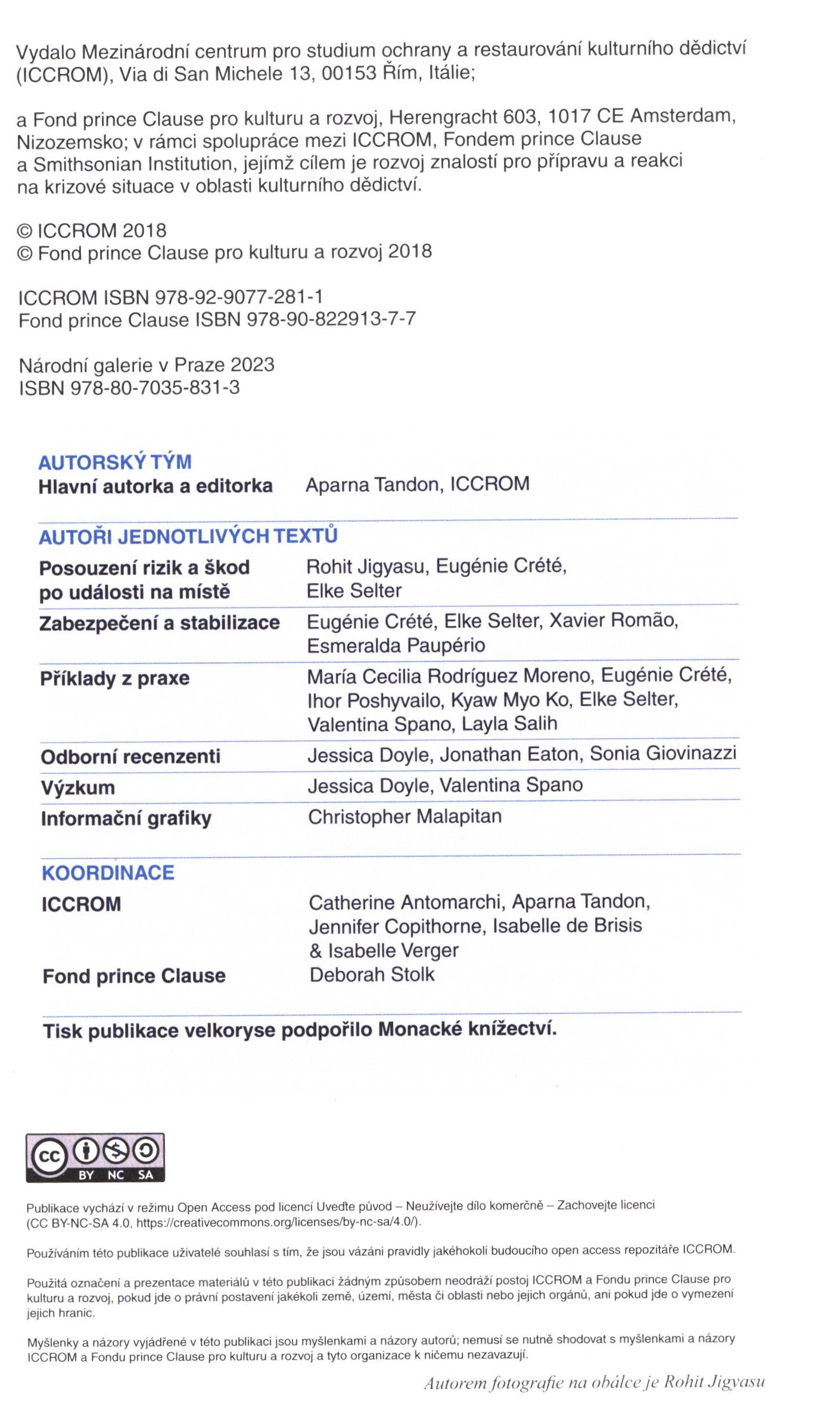Title information První pomoc pro kulturní dědictví během krize : příprava na krizové situace, koordinovaná reakce a zabezpečení materiálního i nemateriálního kulturního dědictví. 2., Manuál / Aparna Tandon ; překlad do češtiny: Kateřina Danielová Personal name Tandon, Aparna (Author) Další autoři Tlachová, Kateřina, 1960- (Translator) Publication [Praha] : Metodické centrum pro muzea výtvarného umění, Národní galerie v Praze, 2023 Scope 102 stran : ilustrace (převážně barevné) ; 21 cm ISBN 978-80-7035-832-0 (brožováno) Country Czech Republic Language Czech Language of the original English Note Přeloženo z angličtiny. - Nad názvem uvedeni původní vydavatelé. - Terminologický slovník