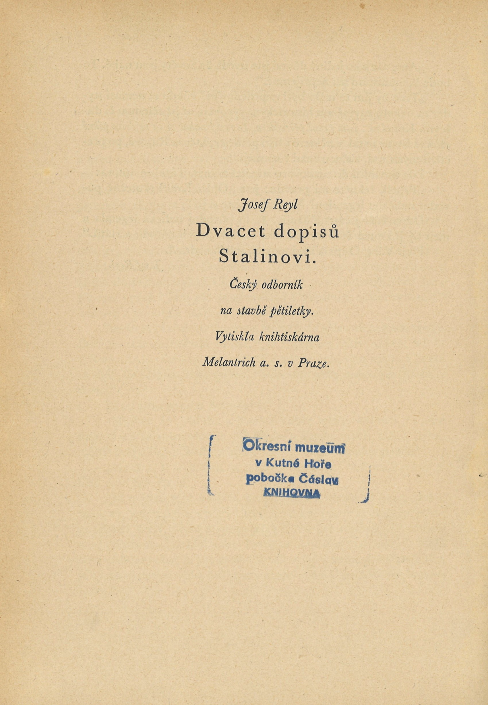 Title information Dvacet dopisů Stalinovi : český odborník na stavbě pětiletky / Josef Reyl Personal name Reyl, Josef, 1889- (Author) Další autoři Stalin, Iosif Vissarionovič, 1879-1953 (Other) Corporation Ladislav Kuncíř (nakladatelství a knihkupectví) (Publisher) Melantrich (tiskárna) (Printer) Publication V Praze : Ladislav Kuncíř, 1932 Manufacture Melantrich, a.s. Scope 266 stran, 30 nečíslovaných stran obrazových příloh : ilustrace, portréty ; 22 cm ISBN (Vázáno) Country Czech Republic Language Czech Note Zdobená barevná obálka. - Černobílé fotografie s popiskami v obrazové příloze na křídovém papíře.