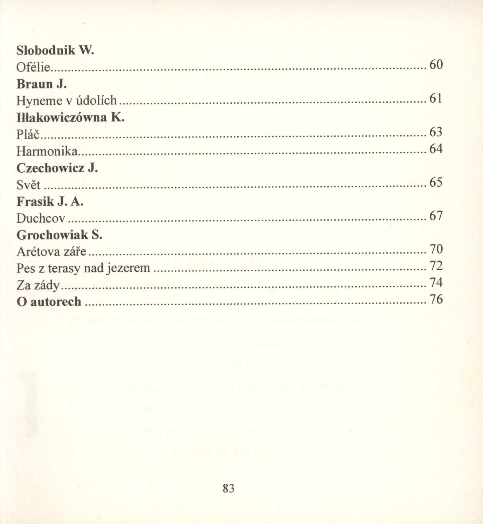 Báseň na sobotu, (Zdenka Brožová, Periskop)Country Czech Republic Language Czech Language of the original Polish Note Zdobená obálka. - Frontispis. - Černobílé fotografie soch v textu. - Medailonky autorů. - Obsah. - Na zadní straně obálky medailon překladatele s fotem.