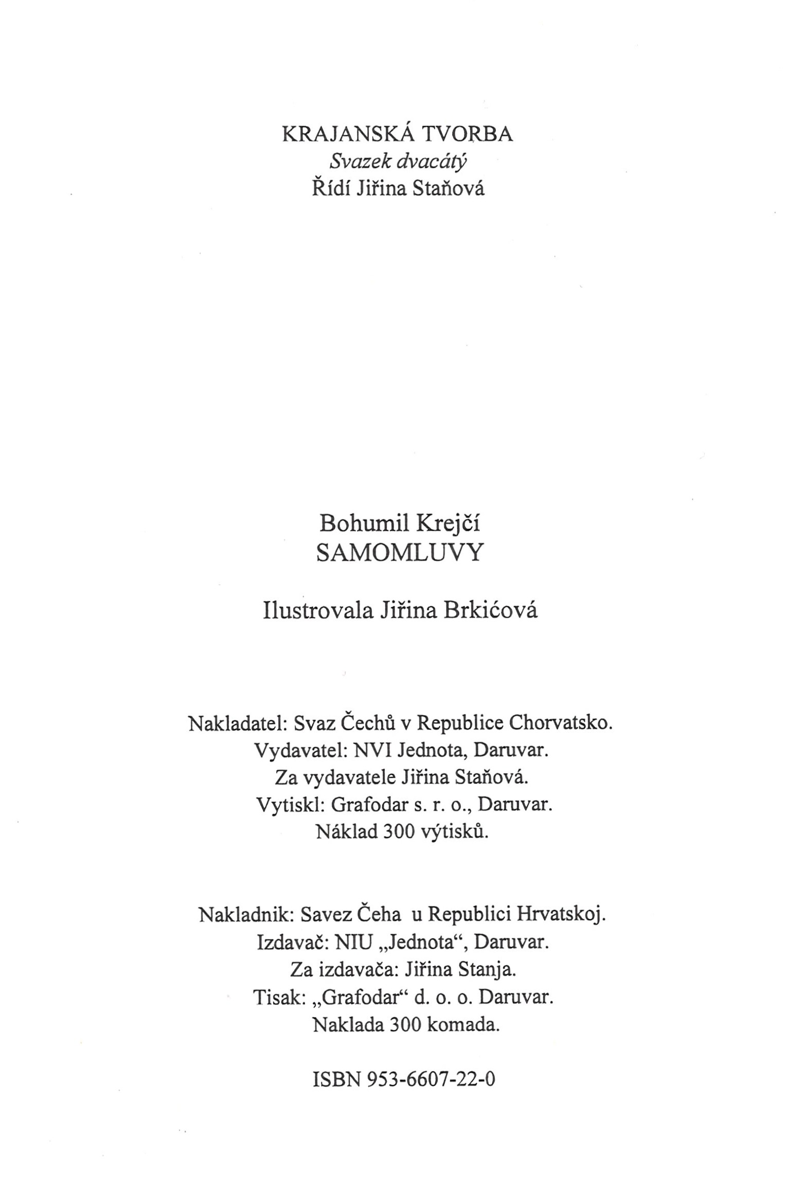 Title information Samomluvy / Bohumil Krejčí ; ilustrovala Jiřina Birkićová Personal name Krejčí, Bohumil, 1940- (Author) Další autoři Birkić, Jiřina, 1955- (Illustrator) Corporation Svaz Čechů v Republice Chorvatsko (Publisher) Novinové nakladatelství Jednota, Daruvar (Publisher) Grafodar, s.r.o. (Printer) Publication Daruvar : Jednota, 2002 Manufacture Grafodar, s.r.o. Scope 79 stran : ilustrace ; 21 cm ISBN 953-6607-22-0 (brožováno) Edition Krajanská tvorba ; svazek 20
