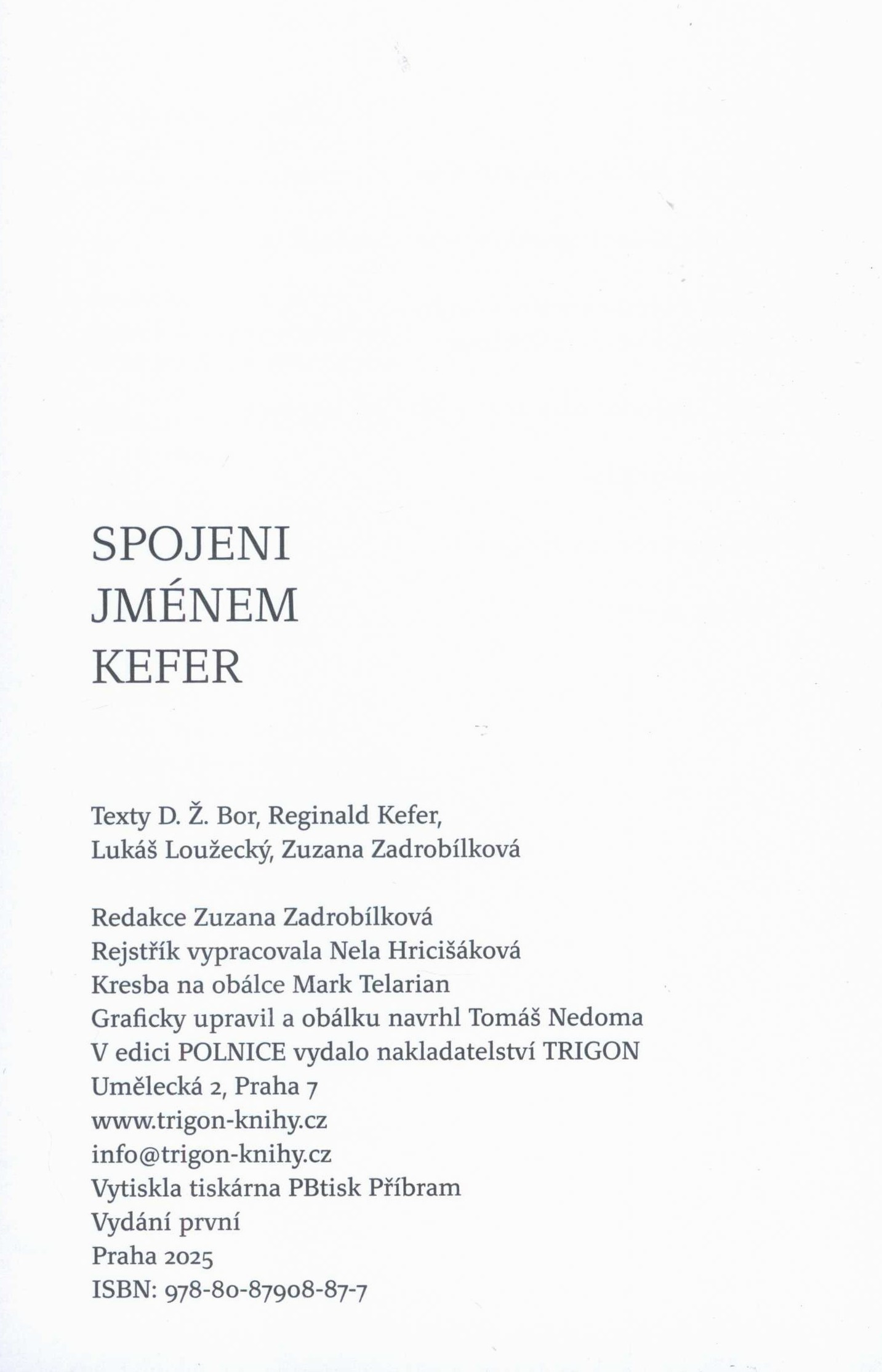 Title information Spojeni jménem Kefer / texty D.Ž. Bor, Reginald Kefer, Lukáš Loužecký, Zuzana Zadrobílková ; kresba na obálce Mark Telarian ; graficky upravil a obálku navrhl Tomáš Nedoma Personal name Bor, D. Ž., 1932-2010 (Author) Další autoři Kefer, Reginald, 1936- (Author) Loužecký, Lukáš (Author) Zadrobílková, Zuzana, 1974- (Author) (Editor) Telarian, Mark (Illustrator) Nedoma, Tomáš, 1984- (Book designer) (Bookjacket designer) Corporation Trigon - knihy (firma) (Publisher) PBtisk (tiskárna) (Printer) Edition statement Vydání první Publication Praha : Trigon, 2025 Manufacture Příbram : PB tisk Scope 222 stran : ilustrace (některé barevné), portréty, faksimile ; 20 cm ISBN 978-80-87908-87-7 (brožováno) Edition Polnice