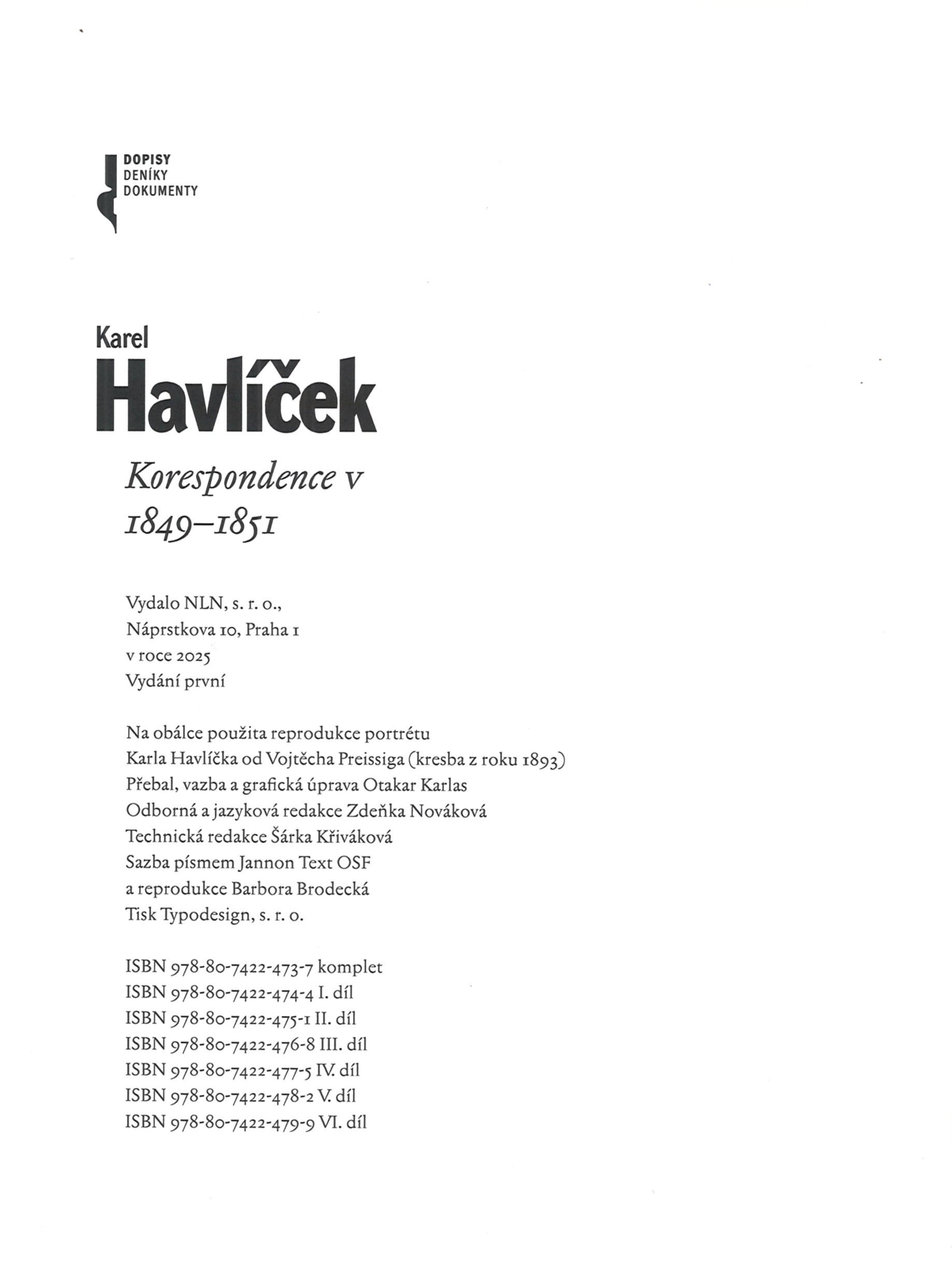 Title information Korespondence. V, 1849-1851 / Karel Havlíček ; přebal, vazba a grafická úprava Otakar Karlas Personal name Havlíček Borovský, Karel, 1821-1856 (Author) (Recipient) (Correspondent) Další autoři Karlas, Otakar, 1956- (Bookjacket designer) (Binding designer) (Book designer) Pokorná, Magdaléna, 1961- (Editor) (wpr) Corporation Lidové noviny (nakladatelství) (Publisher) Typodesign (firma) (Printer) Edition statement Vydání první Publication Praha : NLN, 2025 Manufacture [České Budějovice] : Typodesign, s.r.o. Scope 481 stran : ilustrace, portréty, faksimile ; 22 cm ISBN 978-80-7422-473-7 (komplet ; vázáno) 978-80-7422-478-2 (V. díl ; vázáno) Edition Dopisy, deníky, dokumenty