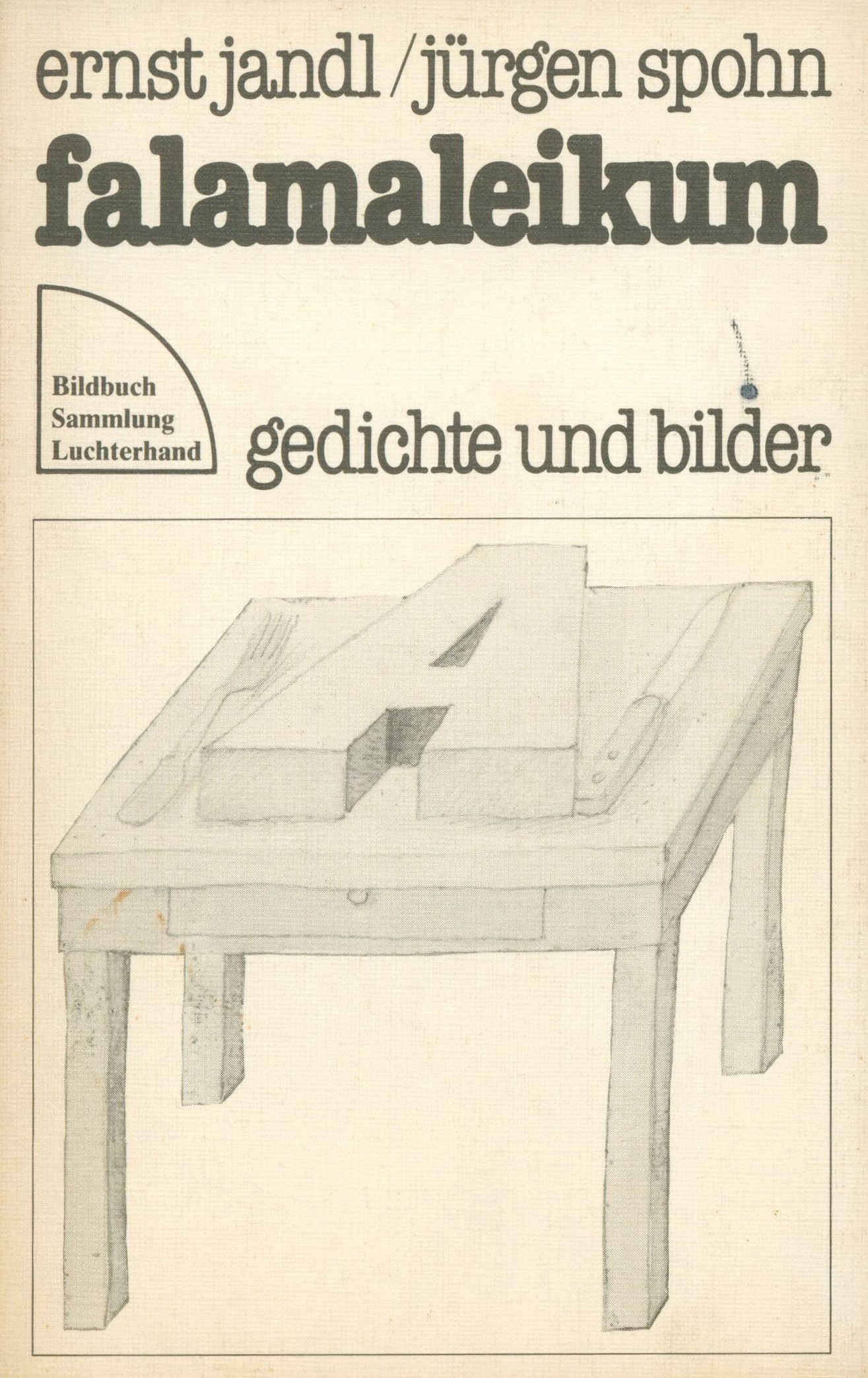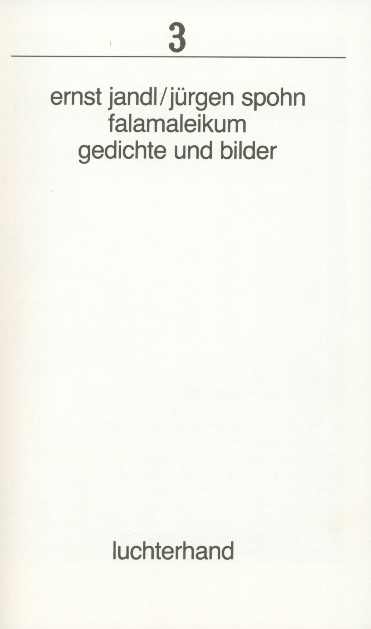 Title information Falamaleikum : gedichte und bilder / Ernst Jandl, Jürgen Spohn Personal name Jandl, Ernst, 1925-2000 (Author) Další autoři Spohn, Jürgen, 1934-1992 (Illustrator) Corporation Hermann Luchterhand Verlag (nakladatelství) (Publisher) Druck- und Verlags-Gesellschaft mbH (tiskárna, Darmstadt) (Printer) Publication Darmstadt ; Neuwied : Luchterhand, 1982 Manufacture Darmstadt : Druck- und Verlags-Gessellschaft mbh Scope 94, 2 stran : ilustrace ; 18 cm ISBN 3-472-68488-7 (brožováno) Edition Sammlung Luchterhand ; 488