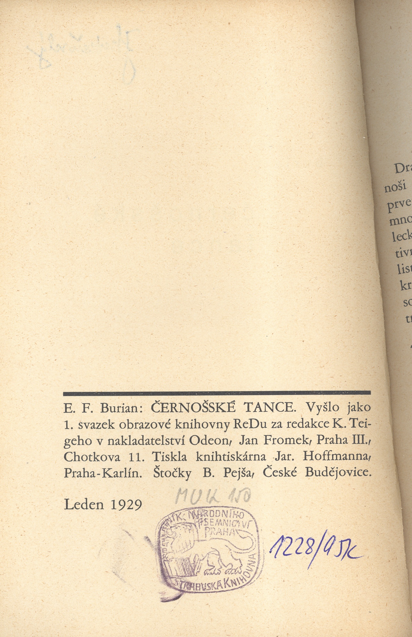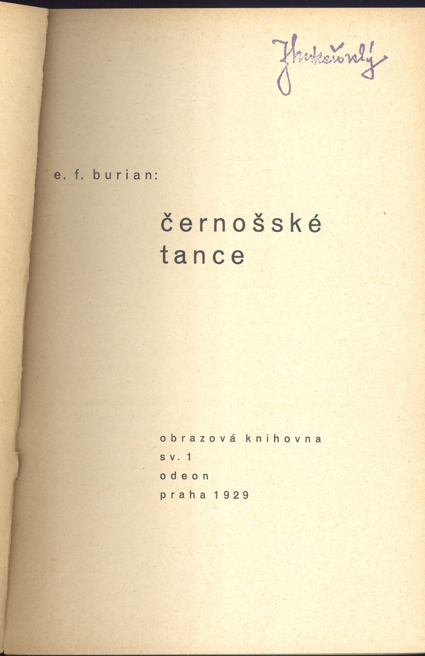 Title information Černošské tance / E. F. Burian Personal name Burian, Emil František, 1904-1959 (Author) Další autoři Teige, Karel, 1900-1951 (Editor) Corporation Odeon, Jan Fromek (Praha) (Publisher) Publication Praha : Odeon, Jan Fromek, 1929 Scope 15 s., 31 l. obr. příl., [2] s. : il. ; 18 cm ISBN brož. Edition Obrazová knihovna ReDu / rediguje Karel Teige sv. 1