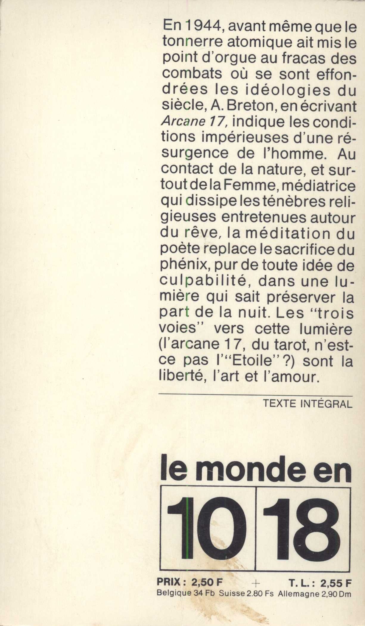 Title information Arcane 17 : enté d'Ajours / par André Breton ; suivi de André Breton ou la transparence par Michel Beaujour Personal name Breton, André, 1896-1966 (Author) Další autoři Beaujour, Michel (Author of afterword, colophon, etc.) Pauvert, Jean-Jacques, 1926-2014 (Publisher) Corporation Union genérale d'éditions (Publisher) Bussière (firma) (Printer) Publication Paris : Union générale d'éditions, ©Éditions Jean-Jacques Pauvert, 1965 Manufacture Saint-Amand (Cher) : Imprimerie Bussière Scope 183 stran ; 18 cm ISBN (Brožováno) Edition Le Monde en 10/18 ; 250