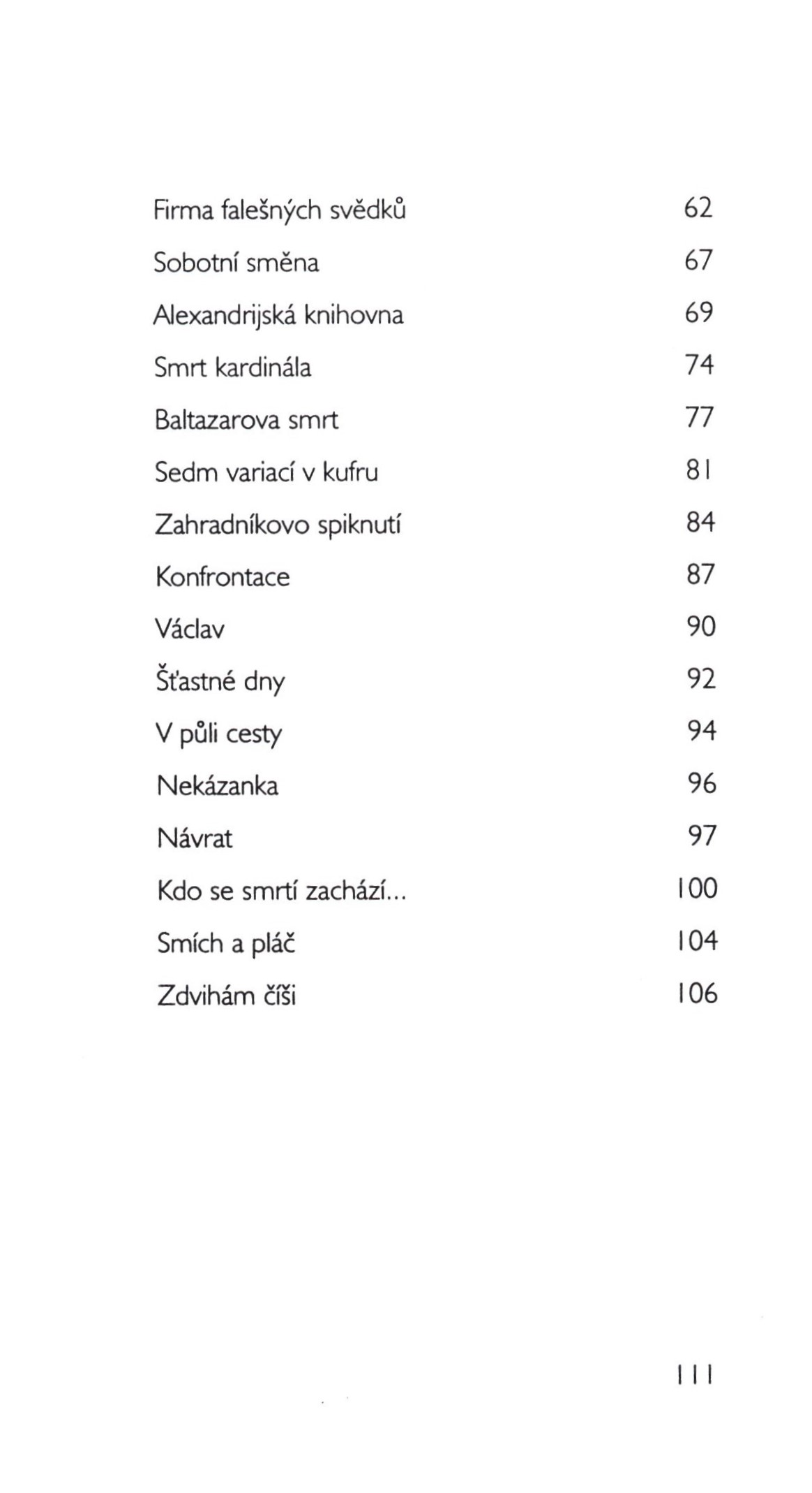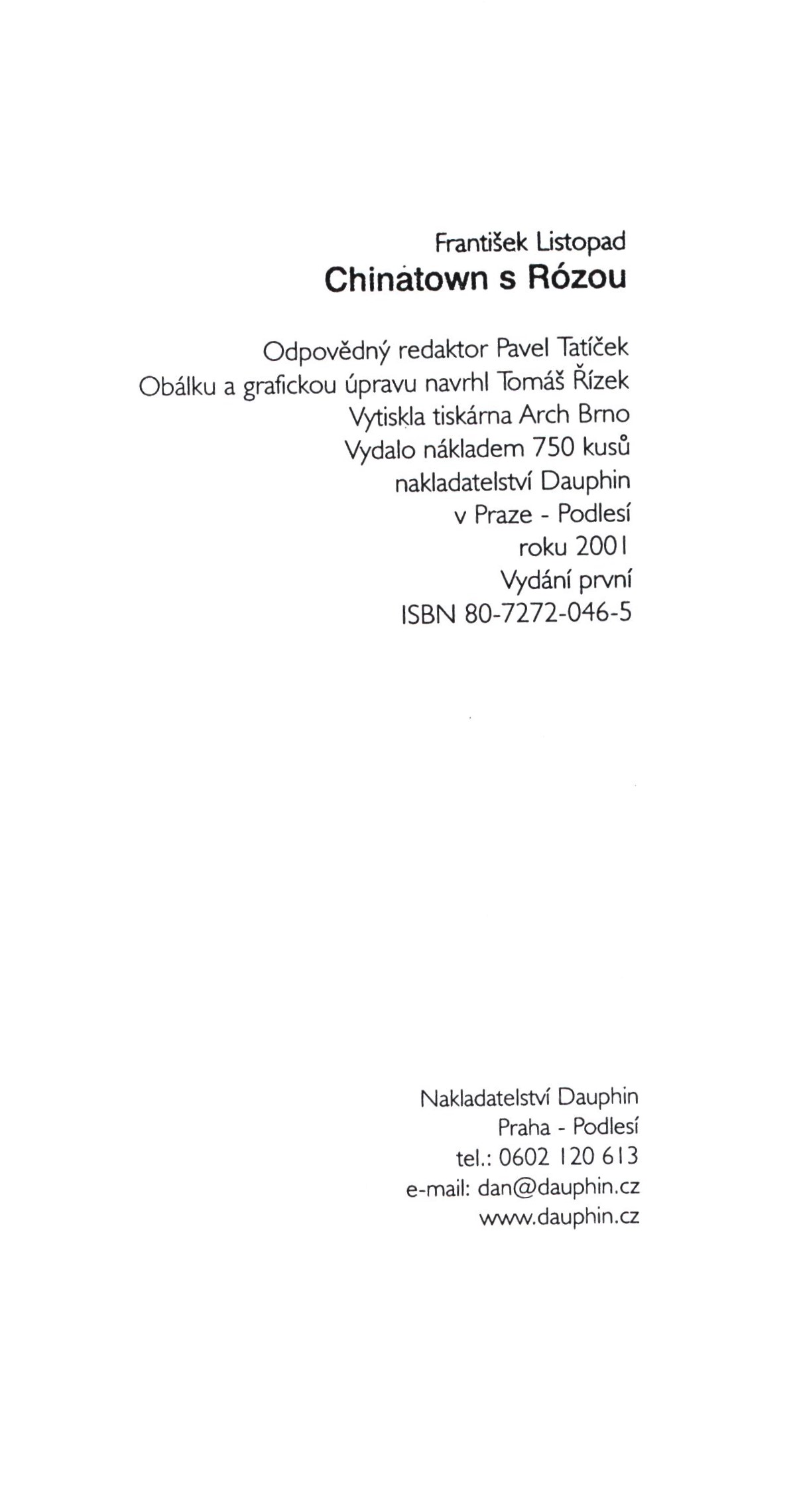 Zdobená barevná obálka. - Přes obálku založená bílá páska s nápisem přes přední stranu obálky: „kniha do snových vlaků... kniha do snových vlaků..." a nápisem přes zadní stranu obálky: „... zanechte prosím ve snovém kupé dalšímu čtenáři...". - Na přední záložce poznámka o autorovi s čb. fotografií autora. - Typografický titulní list. - Obsah. - Tiráž. - Na zadní záložce česká bibliografie autorovy tvorby.