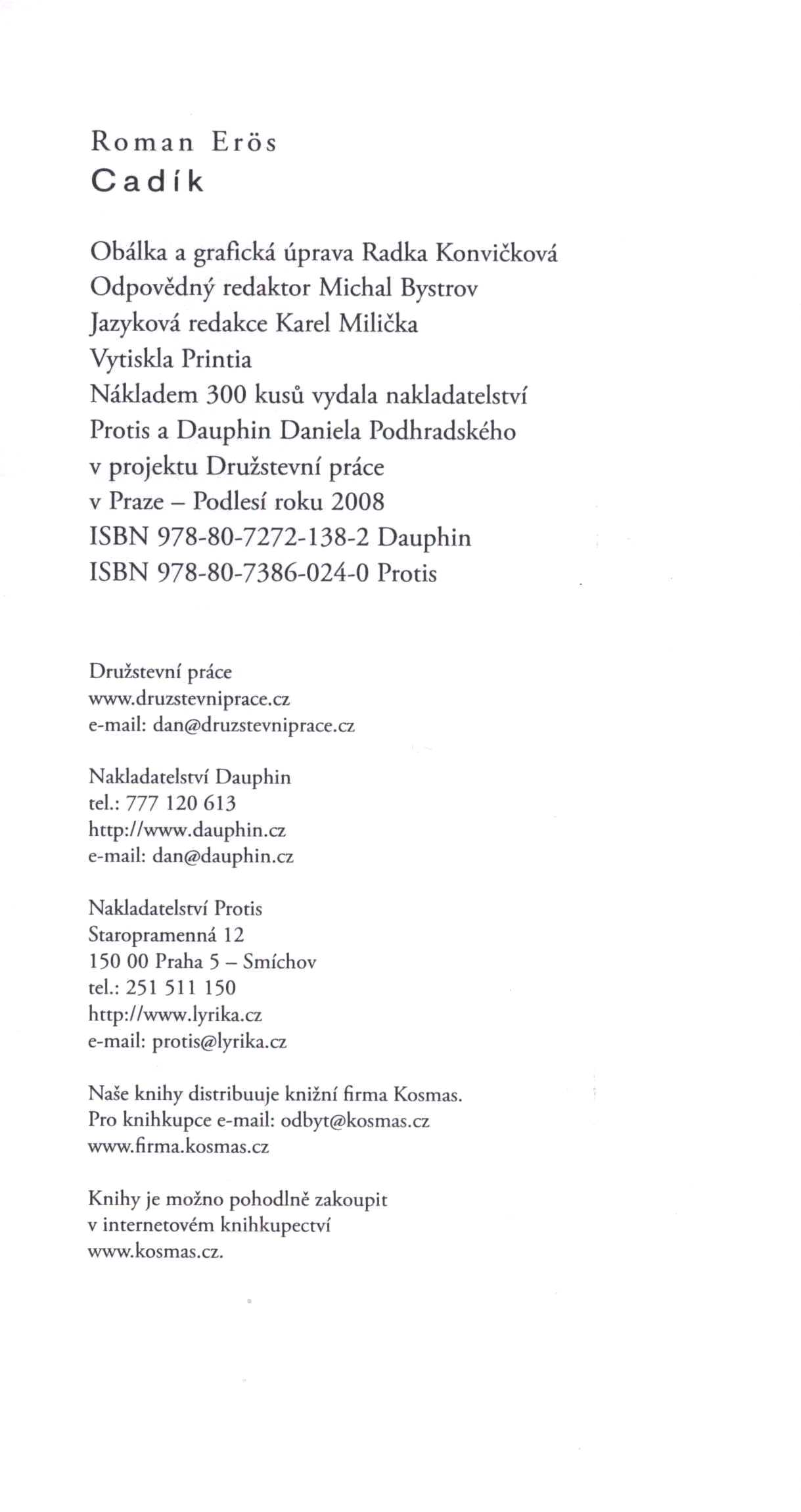 Title information Cadík / Roman Erös ; obálka a grafická úprava Radka Konvičková Personal name Erös, Roman, 1963- (Author) Další autoři Konvičková, Radka, 1963- (Book designer) Corporation Nakladatelství Dauphin (Publisher) Protis (nakladatelství) (Publisher) Printia (Printer) Publication V Praze - Podlesí : Dauphin : Protis, 2008 Manufacture [Praha] : Printia Copyright notice date ©Družstevní práce - Dauphin/Protis, 2008 Scope 148 stran ; 20 cm ISBN 978-80-7272-138-2 (Dauphin : brožováno) 978-80-7386-024-0 (Protis : brožováno) Edition Družstevní práce. [Próza] ; 2