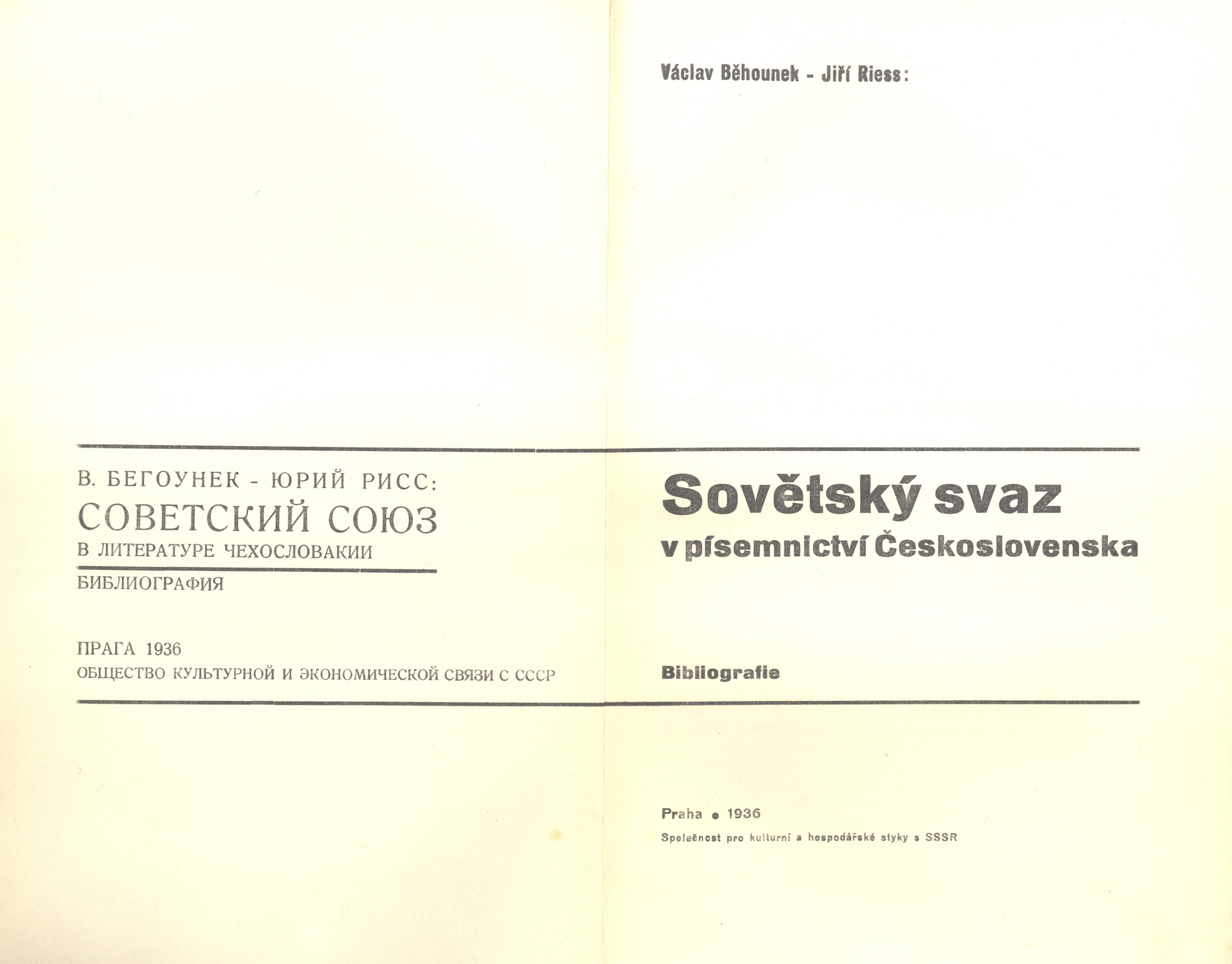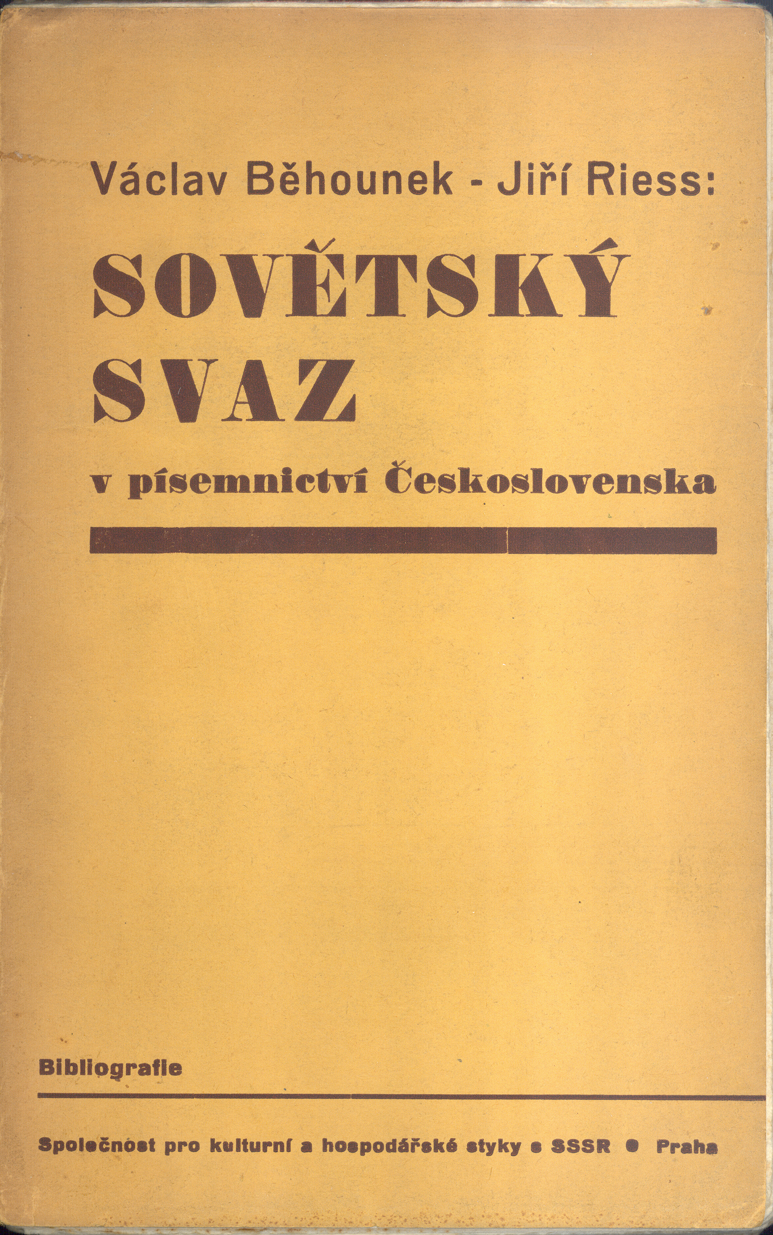Title information Sovětský svaz v písemnictví Československa : bibliografie / Václav Běhounek, Jiří Riess ; [typogafická úprava Karel Teige] Personal name Běhounek, Václav, 1902-1980 (Author) (Author of introduction) Další autoři Rys, Jiří, 1901-1986 (Author) Teige, Karel, 1900-1951 (Graphic technician) (Bookjacket designer) Corporation Společnost pro kulturní a hospodářské styky s SSSR (v Praze) (Publisher) V. Palán (knihtiskárna) (Printer) Publication Praha : Společnost pro kulturní a hospodářské styky s SSSR, 1936 Manufacture (vytiskl Václav Palán v Praze-Král. Vinohradech) Scope xvi, 253, [3]s. ; 21,1 cm Country -cs Language Czech * Russian Note Titulní list a předmluva souběžně rusky.