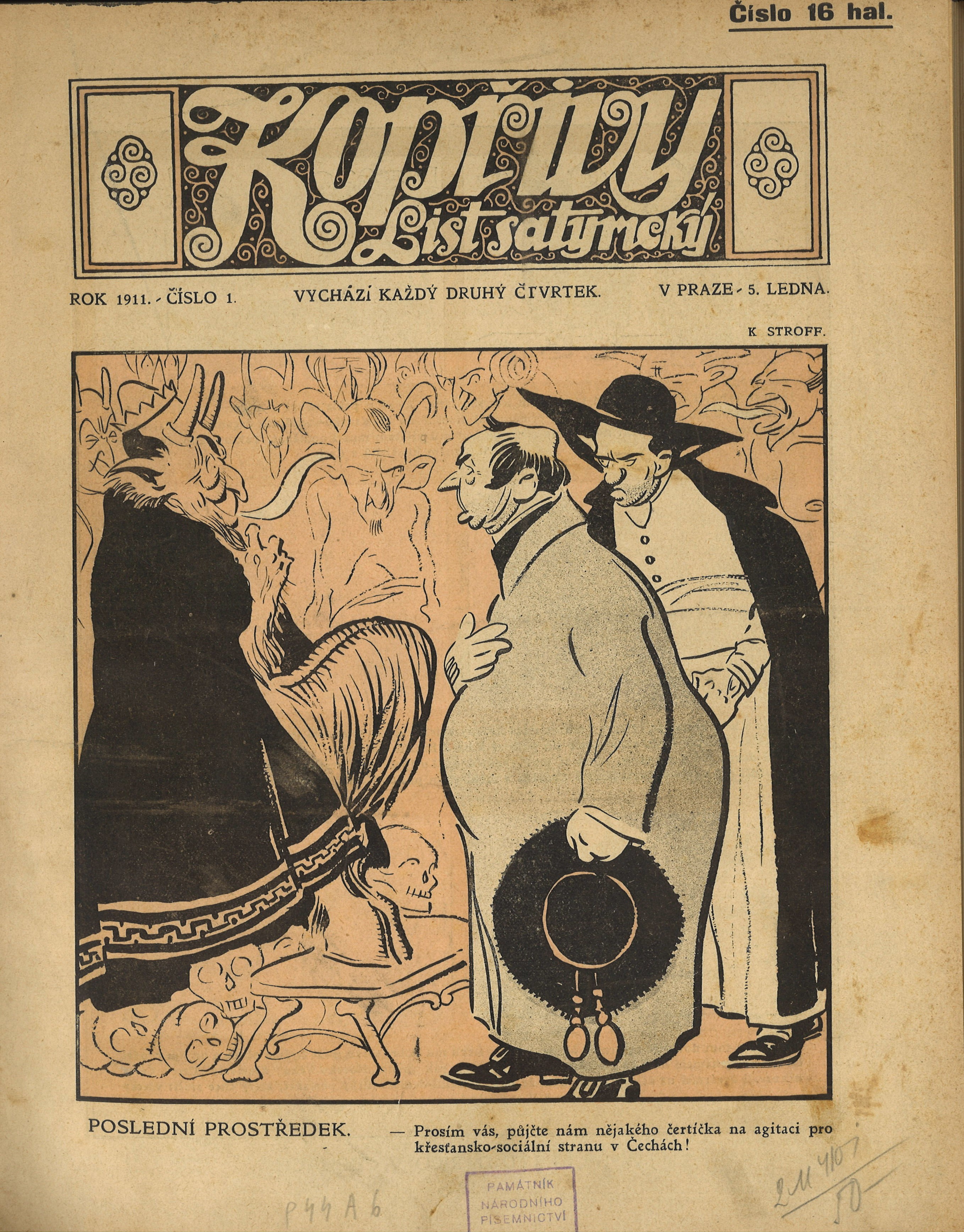 $b Otakar Janáček 300 $b ilustrace ; $c 31,5 cm 310 $a 1x za 14 dní 336 $a text $b txt $2 rdacontent 338 $a svazek $b nc $2 rdacarrier 500 $a Dvacet šest čísel ve dvaceti šesti sešitech. - Barevné zdobené obálky (obsahují většinou jednu celostránkovou barevnou satirickou ilustraci). - Množství barevných i černobílých celostránkových satirických kreseb (kreslené vtipy), ilustrací článků apod. různých autorů (např.K. Stroff, T. R. Chvojka, F. Naske, V. Hübschmann, F. Tratnik, F. Naske, K. Nejedlý). - Iniciálová výzdoba. 500 $a "Kopřivy vycházejí v Praze každý druhý čtvrtek. Roční předpl. K 4.16. Jednotlivá čísla po 16 hal. Předplatné do cizozemska 5 kor. 50 hal." 508 $a "Redakce a administrace v Praze, Myslíkova ul. 1959-II. (Tiskový výbor českosl. soc.-dem. strany dělnické). Zodpov. redaktor J. Stivín-Foltýn. Vydavatel J. Süss." 520 $a Satirický časopis socialistické, resp. sociálnědemokratické orientace. Byl bohatě ilustrován celostránkovými satirickými vtipy četných autorů (např. J. Panuška, K. Nejedlý, K. Stroff, V. H. Brunner, J. T. Blažek, F. Tratnik, Angelo Zeyer, Z. Kratochvíl) a obsahoval krátké vtipy, básně a prózy. Útočil především na politické konkurenty sociální demokracie, průmyslníky a církev. -- (kkper) 538 $a 1-26 (5. ledna - 21. prosince 1911) 550 $a Od č. 22 tiskem Práva Lidu (Skalák a spol.) 653 1-