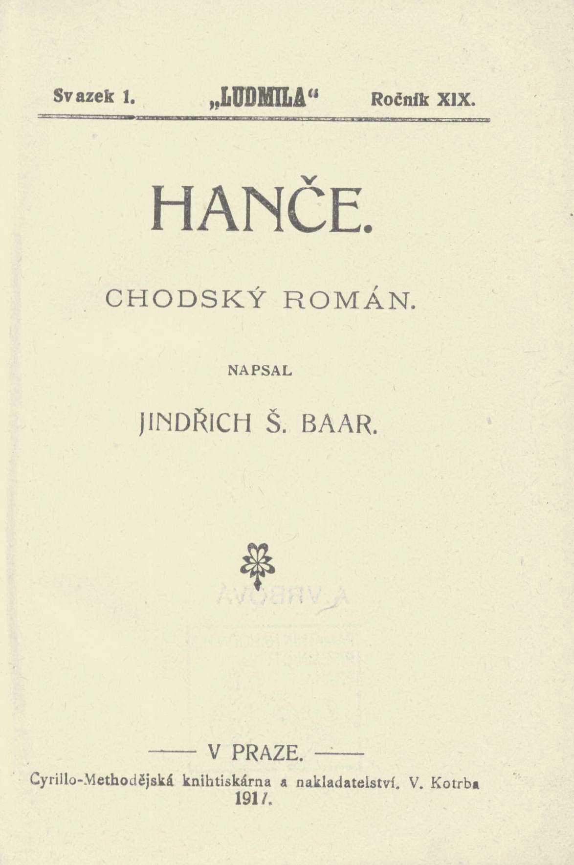 Title information Hanče : chodský román / napsal Jindřich Š. Baar Personal name Baar, Jindřich Šimon, 1869-1925 (Author) (Dedicator) Další autoři Cyrilometodějská knihtiskárna, knihkupectví a nakladatelství (Publisher) Publication V Praze : Cyrillo-Methodějská knihtiskárna a nakladatelství V. Kotrba, 1917 Scope 159 stran ISBN (Vázáno) Edition Ludmila : sbírka zábavné četby pro český lid ; roč. 19. sv. 1.