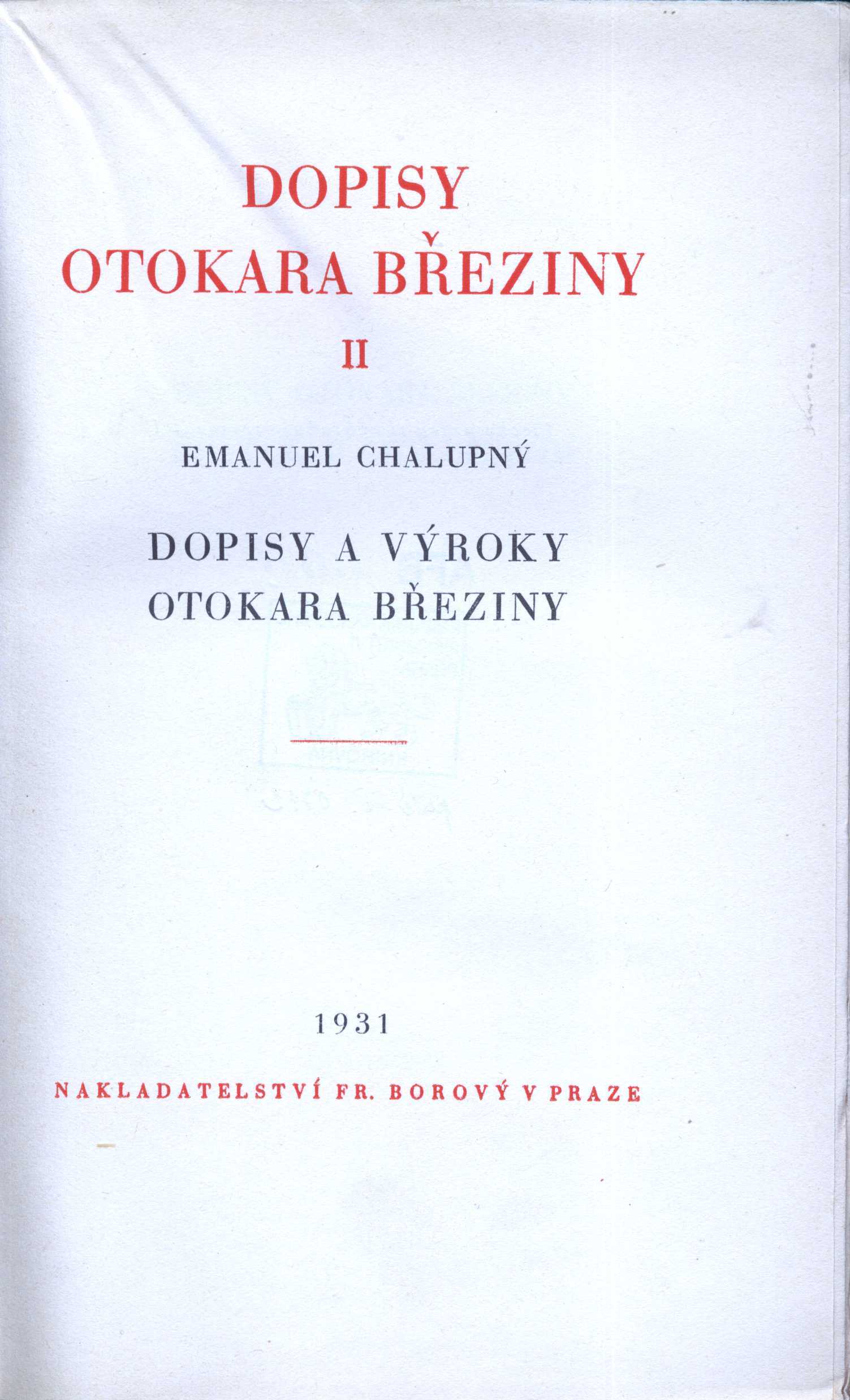 1. Title informationDopisy Otokara Březiny / Emanuel Chalupný ; [upravil A. Chlebeček]. [Sv.] II, Dopisy a výroky Otokara Březiny