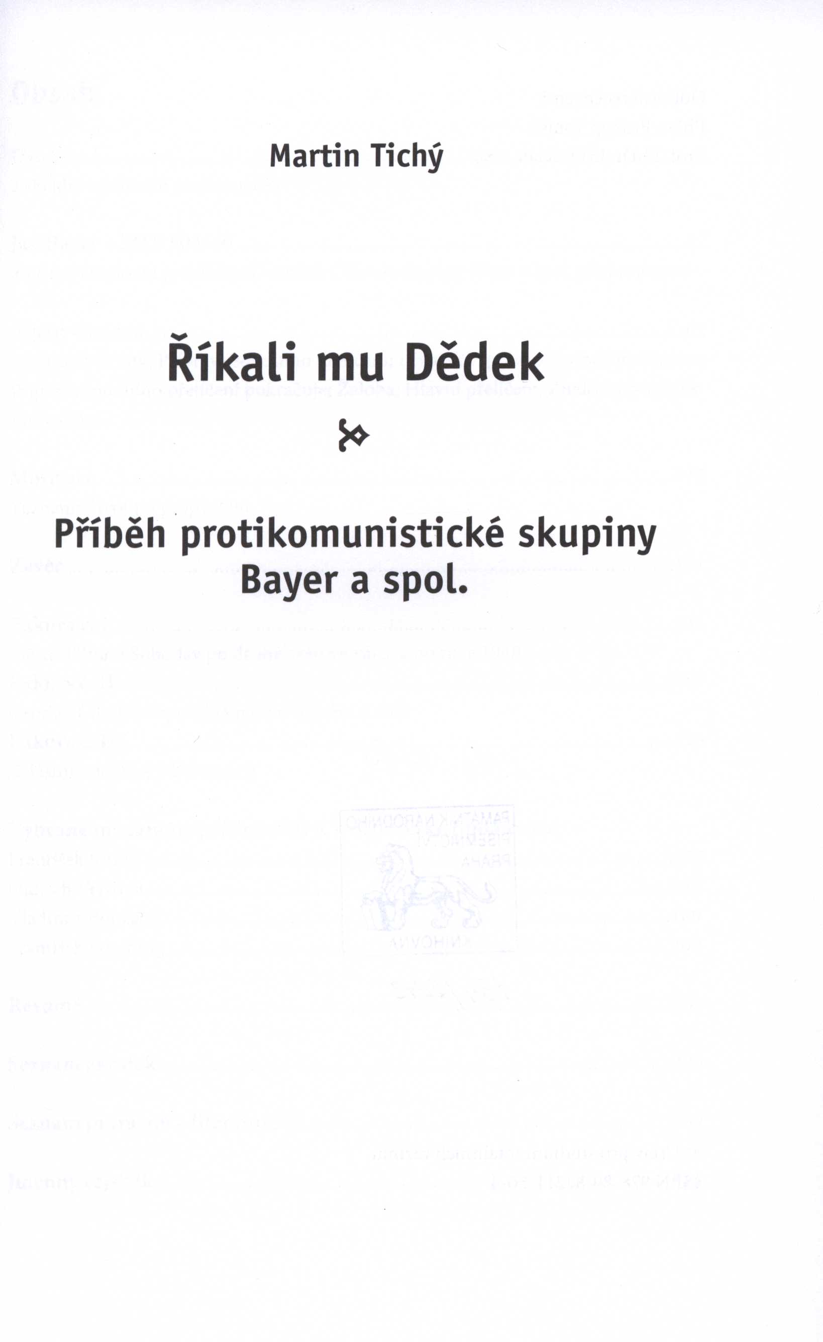 Title information Říkali mu Dědek : příběh protikomunistické skupiny Bayer a spol. / Martin Tichý ; [grafická úprava a zlom Zuzana Michálková, Jaroslav Ježek] Personal name Tichý, Martin, 1975- (Author) Další autoři Michálková, Zuzana (Book designer) Ježek, Jaroslav (Book designer) Publication Praha : Ústav pro studium totalitních režimů, [2011] Manufacture (Europrint) Scope 218 s. : il., faksim. ISBN 978-80-87211-56-4 (váz.) Country Czech Republic Language Czech Note Zdob. obálka. -- Na zadní straně obálky poznámka o knize a autorovi. -- Čb. portrétní fotografie, kresby a faksimile. -- Obsahuje bibliografické odkazy, bibliografii a rejstřík. -- Anglické resumé.