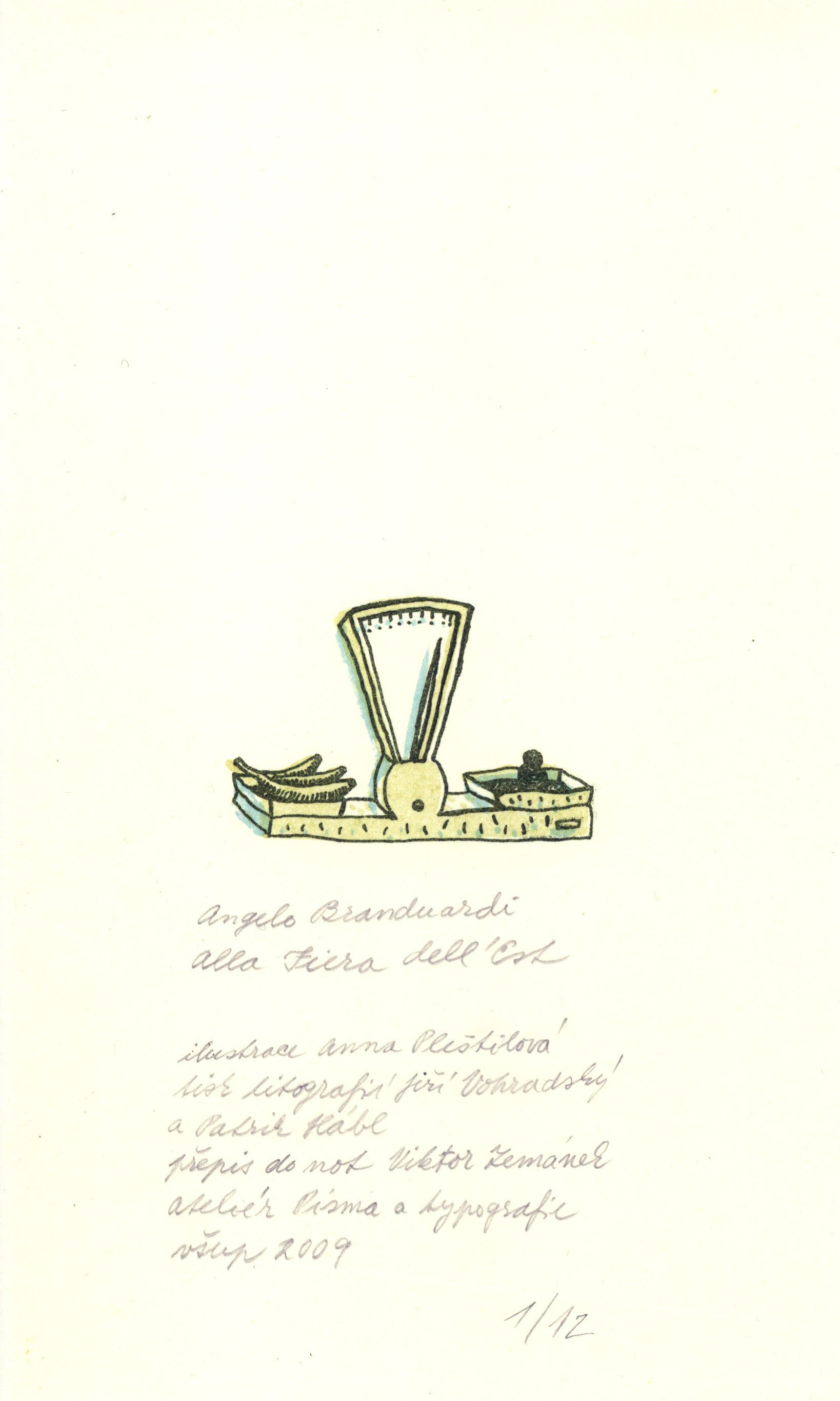 Title information Alla Fiera dell´Est / Angelo Branduardi ; [ilustrace Anna Pleštilová ; tisk litografií Jiří Vohradský a Patrik Hábl ; přepis do not Viktor Zemánek] Personal name Branduardi, Angelo, 1950- (Author) Další autoři Pleštilová, Anna, 1986- (Illustrator) Vohradský, Jiří, 1961- (Lithographer) Hábl, Patrik, 1975- (Lithographer) Zemánek, Viktor (Other) Corporation Vysoká škola uměleckoprůmyslová (Praha, Česko) (Publisher) Publication [Praha] : VŠUP, ateliér Písma a typografie, 2009 Scope [10] l. barev. il. ; 24 cm + 1 CD ISBN volné listy Country Czech Republic Language Italian * Czech Language of the original Italian Note V barevně ilustrovaných rozkládacích deskách volně vloženo 10 listů s ilustracemi a 1 malé hudební CD.