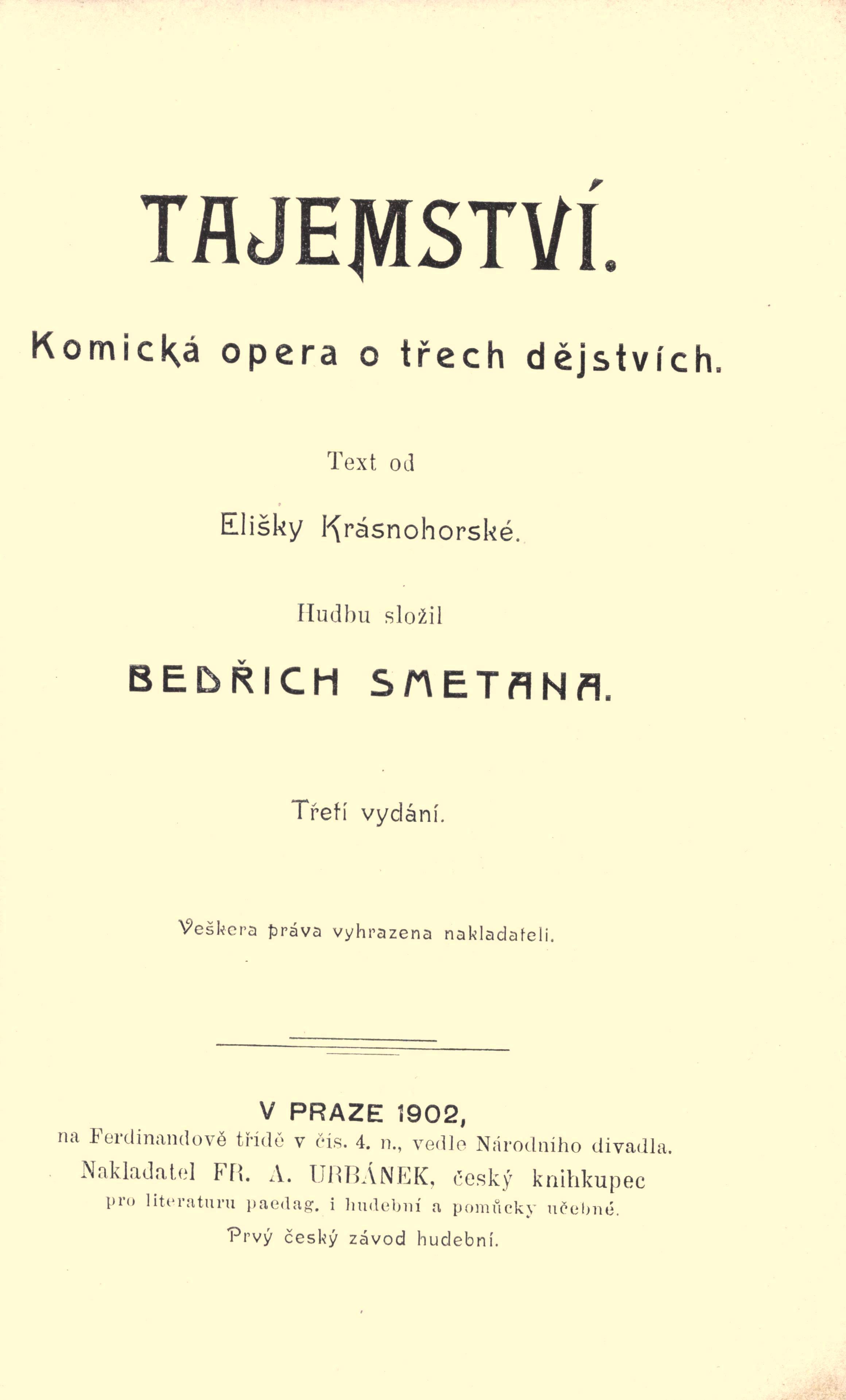 Title information Tajemství : komická opera o třech dějstvích / Text od Elišky Krásnohorské / Hudbu složil Bedřich Smetana Personal name Krásnohorská, Eliška, 1847-1926 (Librettist) Další autoři Smetana, Bedřich, 1824-1884 (Composer) Corporation Fr. A. Urbánek (nakladatelství) (Publisher) Politika (tiskárna, nakladatelství) (Printer) Edition statement 3. vyd. Publication V Praze : Fr. A. Urbánek, 1902 Manufacture (Politika) Scope 54 - [2] s. ISBN brož. Edition Urbánkova Bibliotéka operních a operetních textův. Řada II sv. 74