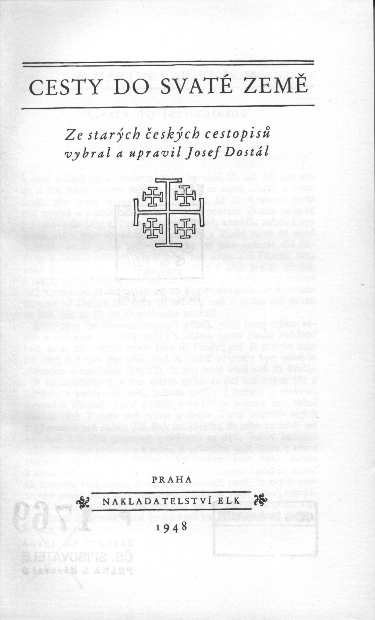 Tiráž: "Cesty do Svaté země. Vybral a upravil dr. Josef Dostál, který také napsal doslov. Vyzdobeno šesti dobovými ilustracemi. Typografická úprava, obálka a vazba jsou provedeny podle návrhu Oldřicha Menharta. Písmem Románský medieval vytiskl Alois Šašek ve Velkém Meziříčí v nákladu 6.600 výtisků. Pro své členy vydal ELK v Praze roku 1948 jako 33. svazek edice Národní klenotnice v rámci příspěvku 70 Kčs. V příspěvku je zahrnut nárok na knihu, Literární noviny a výroční tisk."