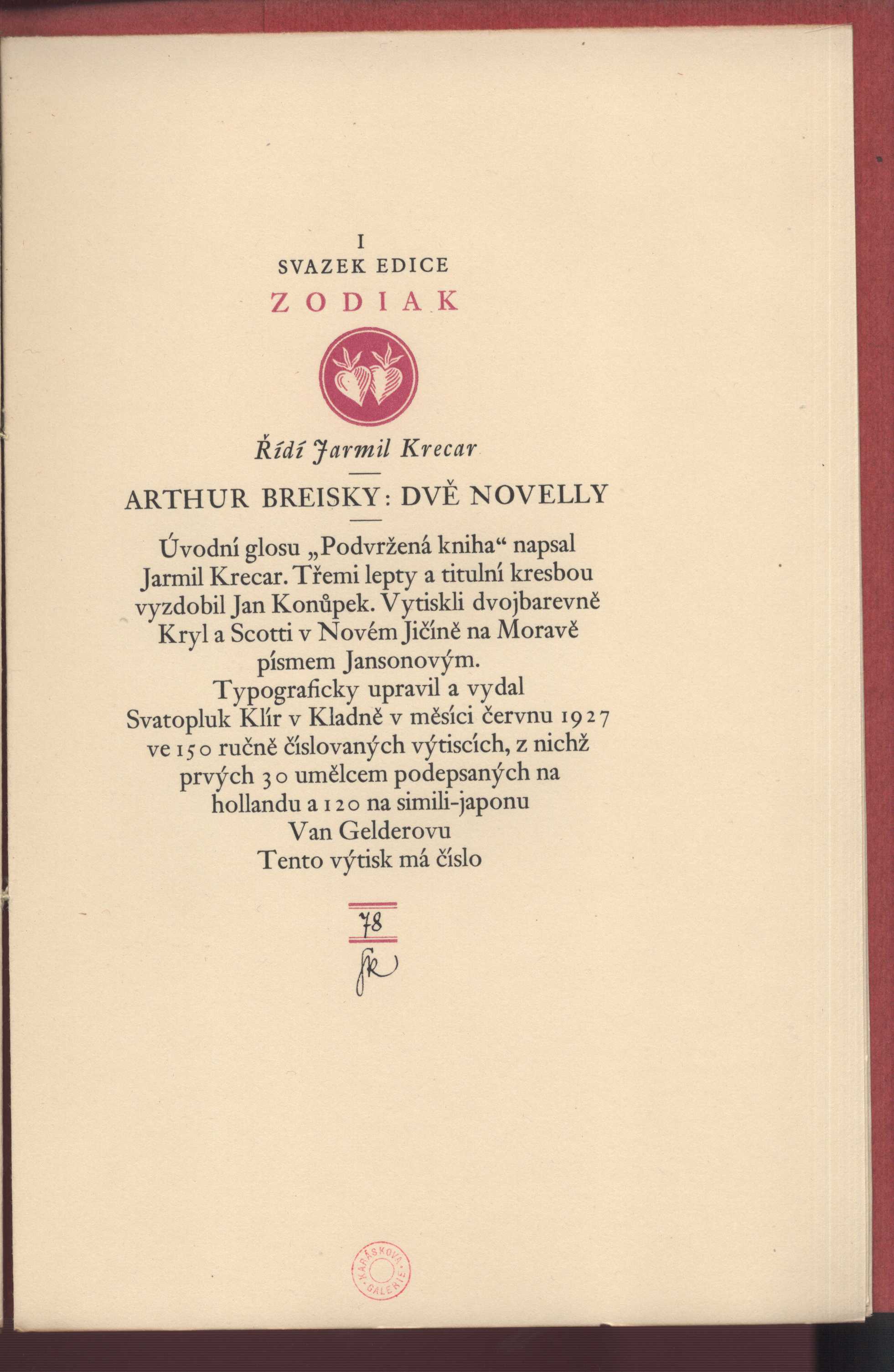 Zodiak (Svatopluk Klír a F. J. Klír)Country Czech Republic Language Czech Note Ochranné kartónové pouzdro. - Do červeného přebalu vloženy sešité archy. - Růžový a černý tisk knihy. - Výzdoba Jana Konůpka: ilustrovaný titulní list a tři lepty (jeden jako frontispis) . - Nakladatelský signet. - Nad tiráží ediční značka. - Typografická úprava Svatopluka Klíra. - Úvod Jarmila Krecara. - Náklad 150 ručně číslovaných výtisků, z nichž prvých 30 umělcem podepsaných na hollandu a 120 na simili-japonu Van Gelderovu.