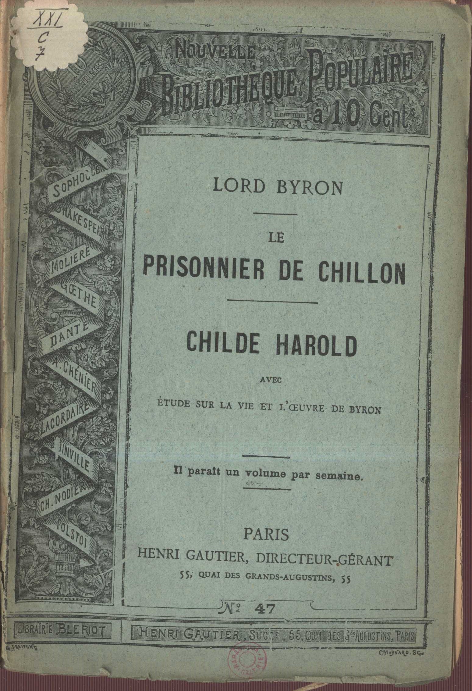 Title information Le prisonnier de Chillon ; Chide Harold : avec étude sur la vie et l'oeuvre de Byron / lord Byron Personal name Byron, George Gordon Byron, baron, 1788-1824 (Author) Další autoři Gautier, Henry, -1938 (Publisher) Corporation Imprimerie A. Burdin et cie (tiskárna) (Printer) Publication Paris : Henri Gautier, [1---] Manufacture (Imprimerie A. Burdin et cie) Scope 32 s. ISBN brož. Edition Nouvelle bibliothèque populaire No 47