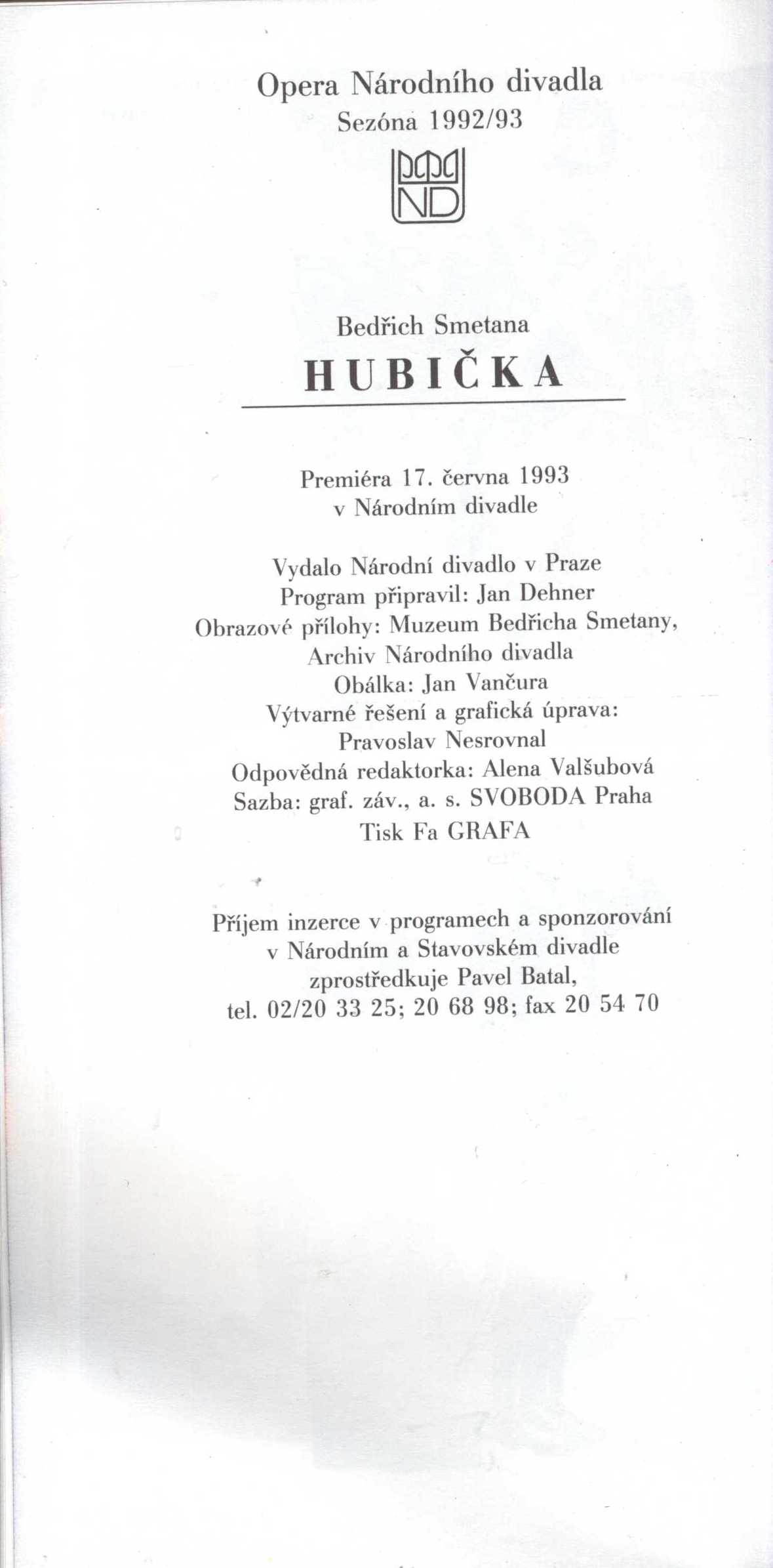 1. Title informationHubička : prostonárodní opera o 2 jednáních : podle povídky Karolíny Světlé / Bedřich Smetana ; text napsala Eliška Krásnohorská ; [program připravil Jan Dehner ; obsah opery Karel Jernek ; charakteristika libreta Jaroslava Janáčková ; výtvarné řešení a grafická úprava Pravoslav Nesrovnal]