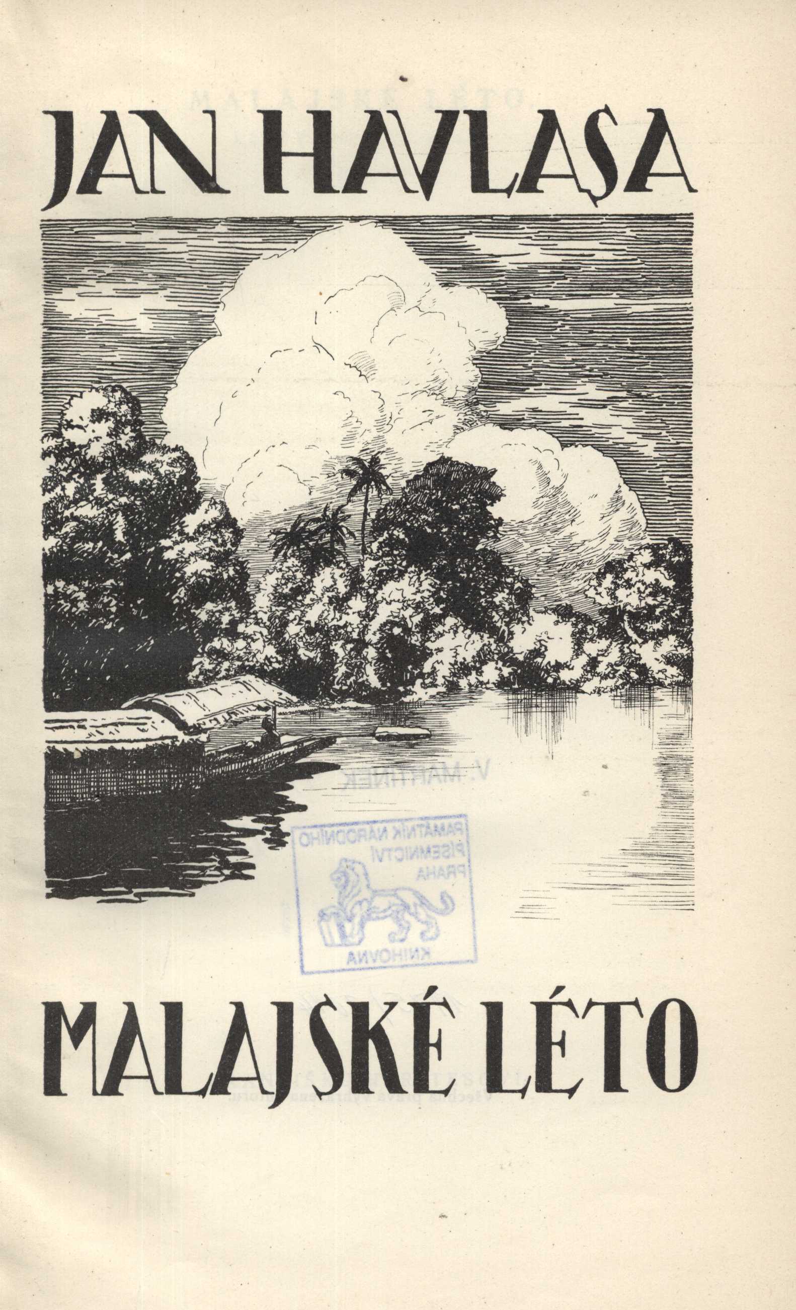 Title information Malajské léto / Jan Havlasa ; s titulní kresbou Otakara Štáfla ; a se 150 obrázky v textu i s 10 holarotypickými přílohami podle snímků Jana Havlasy Personal name Havlasa, Jan, 1883-1964 (Author) (Photographer) (Illustrator) Další autoři Štáfl, Otakar, 1884-1945 (Illustrator) (Bookjacket designer) Mikulová, Helena, 1948-2020 (Former owner) (Donor) Corporation Ústřední nakladatelství a knihkupectví učitelstva českoslovanského (Praha, Česko) (Publisher) Dr. Ed. Grégr a syn (nakladatelství, tiskárna) (Printer) Další var.názvy Listy od rovníku Publication V Praze : Ústřední nakladatelství a knihkupectví učitelstva českoslovanského, 1926 Manufacture (Dr. Ed. Grégr a syn) Scope 361 stran, 10 nečíslovaných listů obrazových příloh : ilustrace ; 24 cm ISBN (Vázáno) Edition Sebrané spisy Jana Havlasy sv. 21