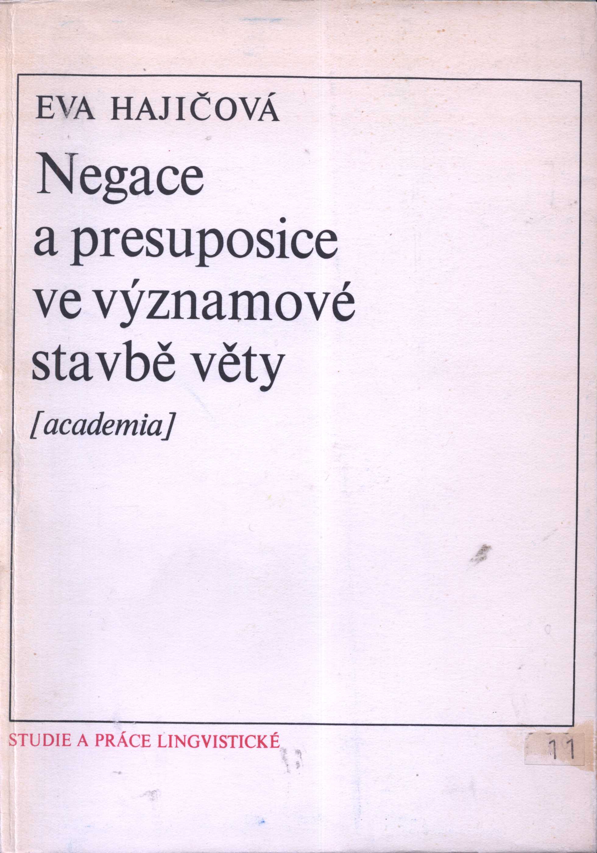 Title information Negace a presupozice ve významové stavbě věty / Eva Hajičová ; [přebal Oldřich Hlavsa] Personal name Hajičová, Eva, 1935- (Author) Další autoři Hlavsa, Oldřich, 1909-1995 (Bookjacket designer) Corporation Academia (nakladatelství) (Publisher) Státní tiskárna v Praze (Printer) Edition statement Vyd. 1. Publication Praha : Academia, 1975 Manufacture Státní tiskárna) Scope 1975 ISBN brož. Edition Studie a práce lingvistické sv. 11
