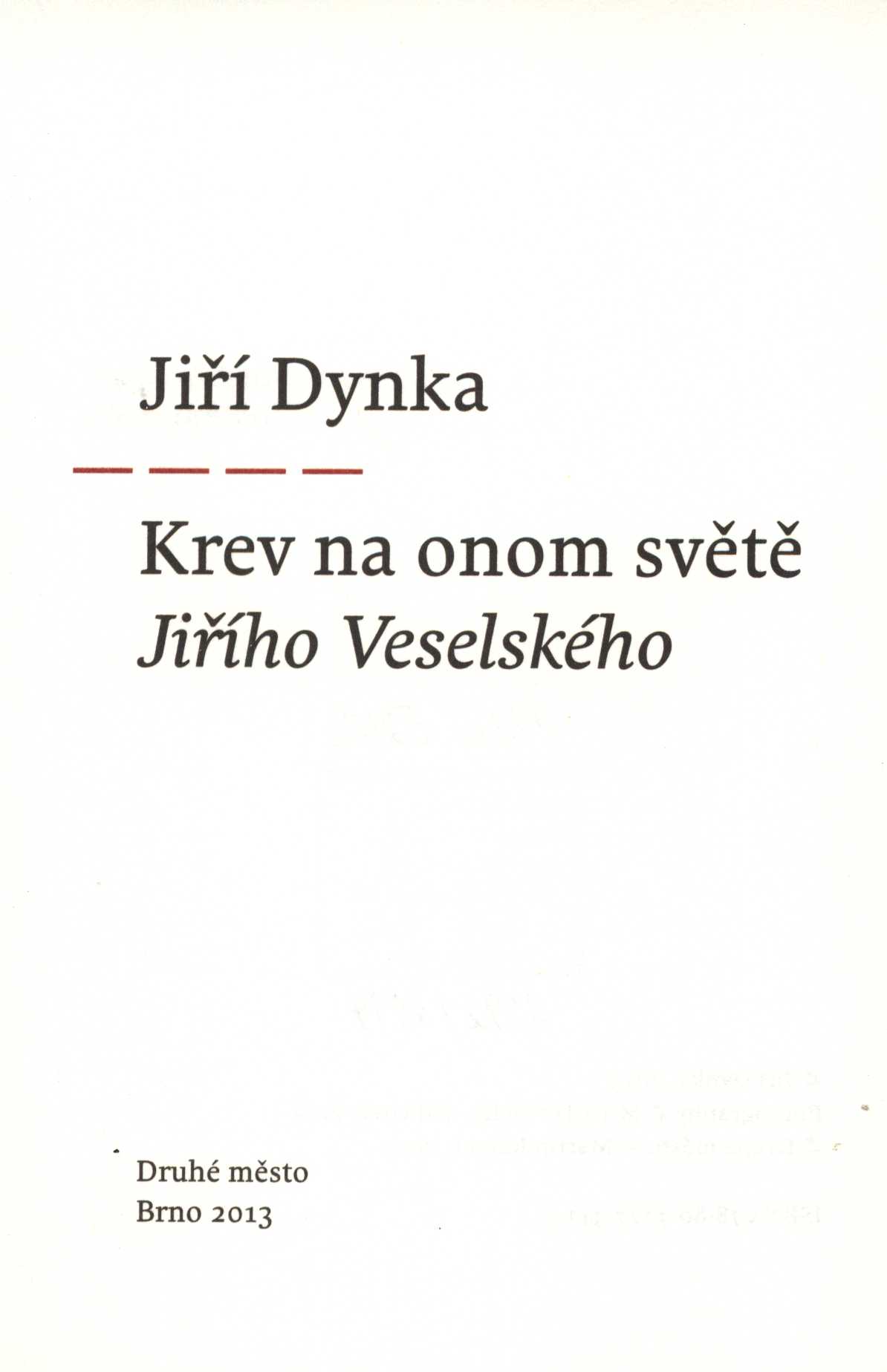 1. Title informationKrev na onom světě Jiřího Veselského / Jiří Dynka ; [fotografie v knize a na pohlednici Miroslav Tichý ; obálka s použitím fotografie Miroslava Tichého a grafická úprava Bedřich Vémola]