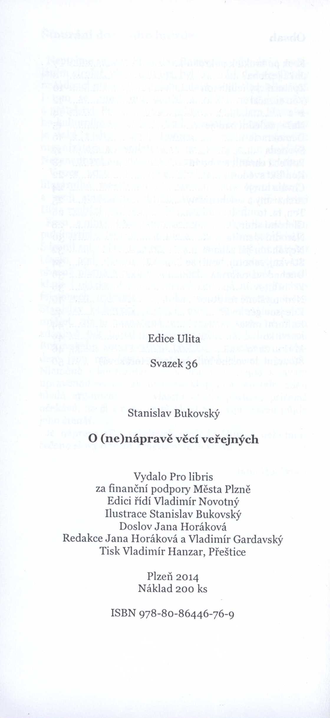 Title information O (ne)nápravě věcí veřejných / Stanislav Bukovský ; [ilustrace Stanislav Bukovský ; doslov Jana Horáková] Personal name Bukovský, Stanislav, 1944- (Author) (Illustrator) Další autoři Horáková, Jana, 1958- (Author of afterword, colophon, etc.) Corporation Pro libris (občanské sdružení, Plzeň) (Publisher) Další var.názvy O nápravě věcí veřejných O nenápravě věcí veřejných Publication Plzeň : Pro libris, 2014 Manufacture Vladimír Hanzar) Scope 48 s. : il. ISBN 978-80-86446-76-9 (brož.) Edition Ulita sv. 36