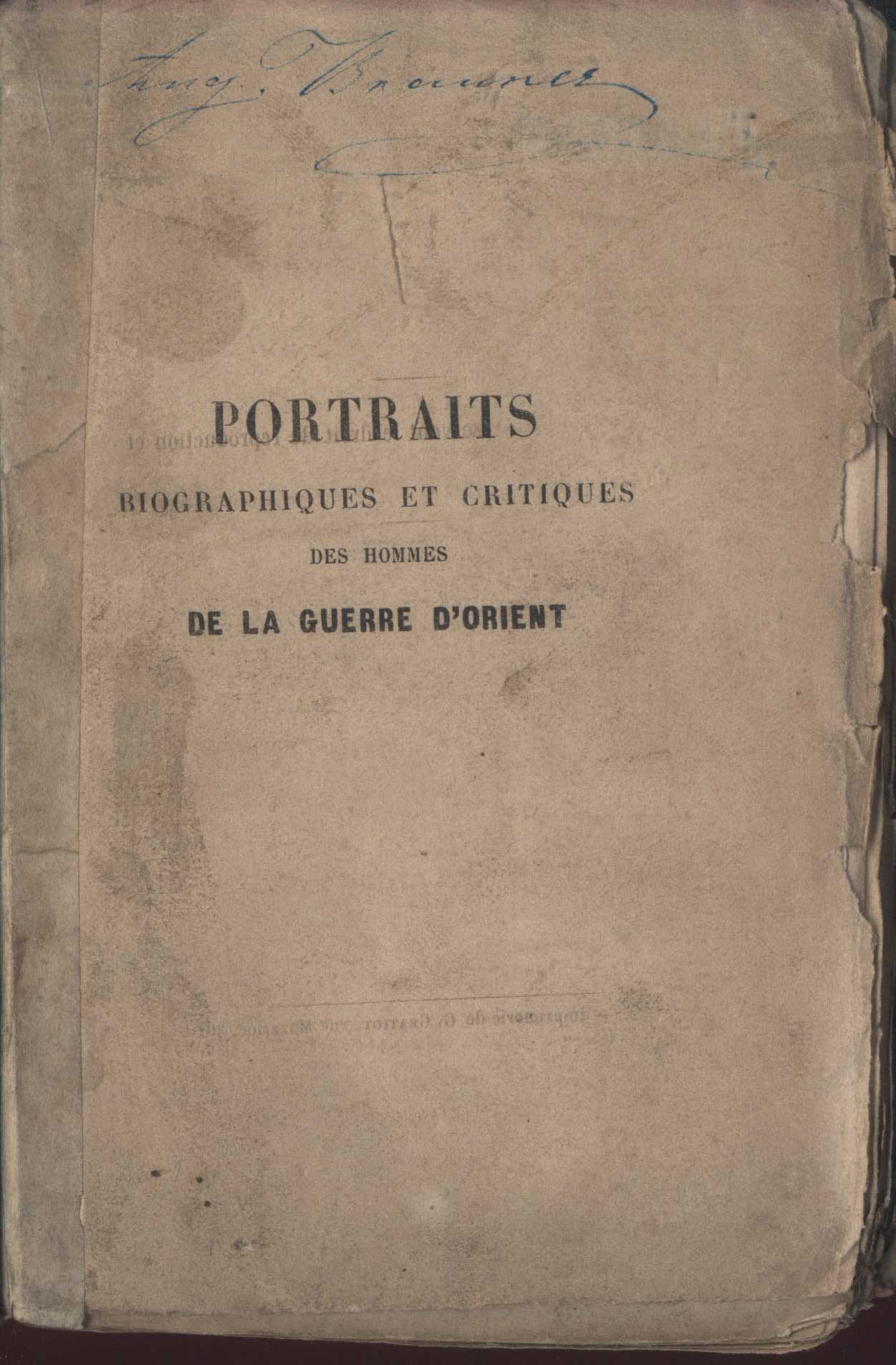 Title information Portraits biographiques et critiques des hommes de la guerre d'Orient / par Alfred des Essarts Personal name Des Essarts, Alfred, 1811-1893 (Author) Další autoři Braunerová, Augusta, 1817-1890 (Inscriber) (Former owner) Corporation Garnier frères (Publisher) Imprimerie de G. Gratiot (tiskárna) (Printer) Publication Paris : Garnier frères, 1855 Manufacture (Imprimerie de G. Gratiot) Scope 484 s. ISBN brož. Country France Language French Note Nakladatelská reklama. - Úvod.