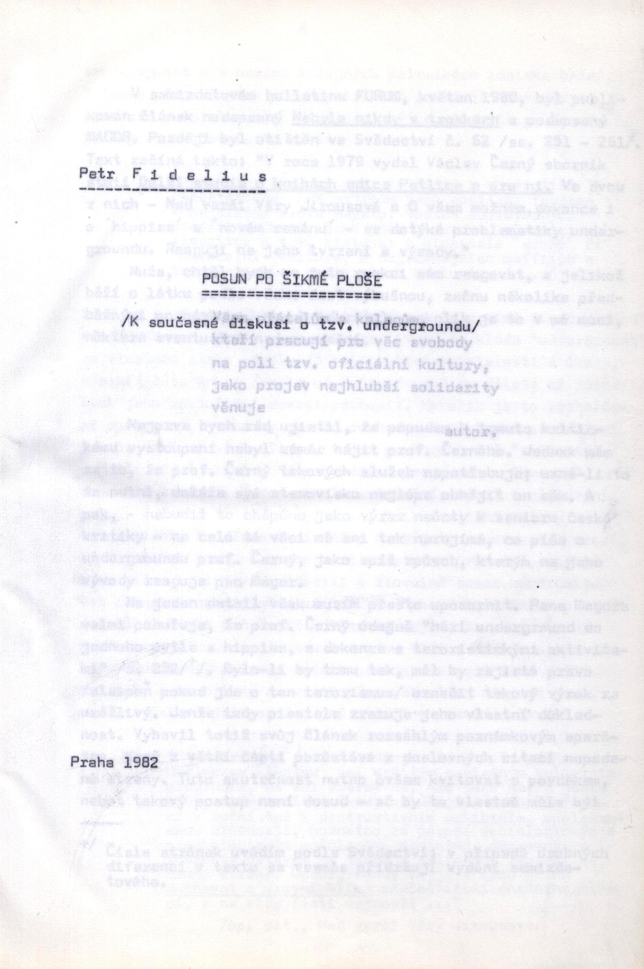Title information Posun po šikmé ploše ; Lid, demokracie, socialismus ; "Pohádka o Stalinovi" v kontextu současné oficiální propagandy : k současné diskusi o tzv. undergroundu : příspěvek ke studiu pojmosloví současné oficiální propagandy / Petr Fidelius Personal name Fidelius, Petr, 1948- (Author) Publication S.l. : s.n., 1978, 1980, 1982 Scope 253 l. ISBN (váz.) Country Czech Republic Language Czech Note Samizdat. - Modré plátěné desky, na hřbetě zlaceně jméno autora. - Obsah. - První příspěvek. - Věnování. - Úvod. - Bibliografické odkazy. - Postskriptum autora. - Druhý příspěvek. - Věnování Z. Sváčkovi. - Seznam zkratek. - Úvod. - Citace. - Bibliografické odkazy. - Praktická cvičení. - Třetí příspěvek. - Citace. - Bibliografické odkazy. - Strojopis na průklepovém papíře.