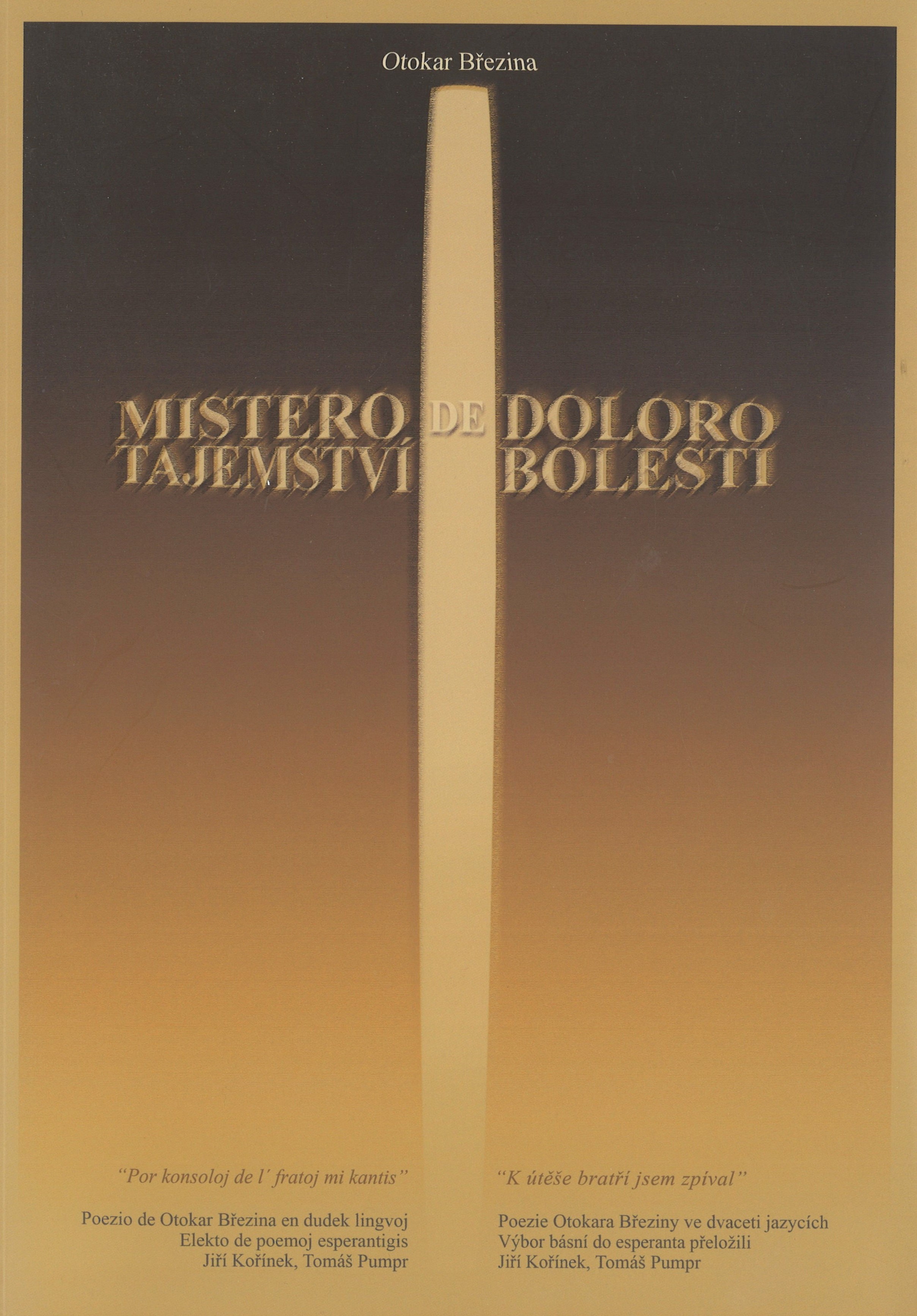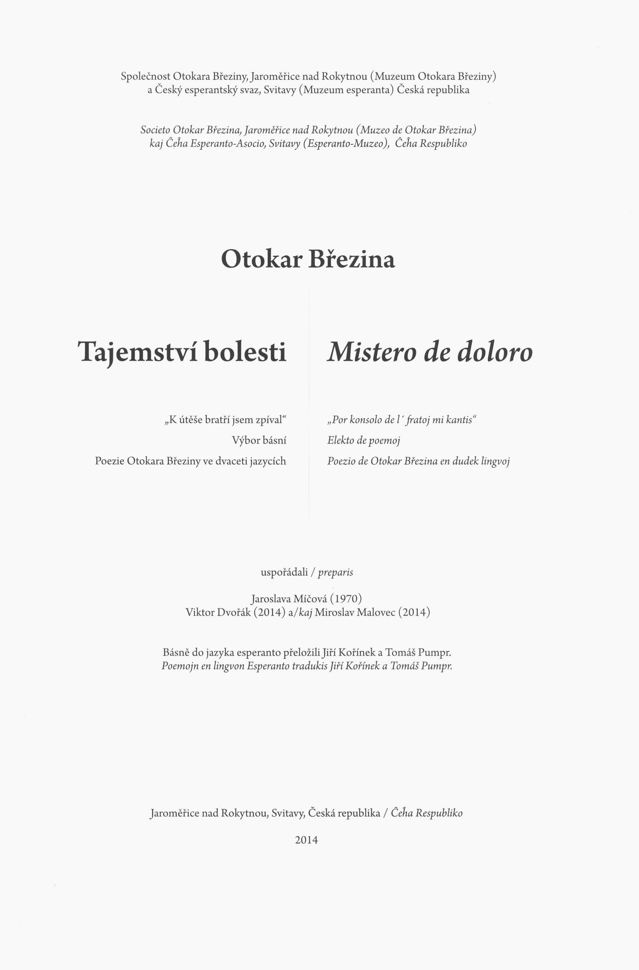 Title information Tajemství bolesti : výbor básní : poezie Otokara Březiny ve dvaceti jazycích = Mistero de doloro : elekto de poemoj : poezio de Otokar Březina en dudek lingvoj / Otokar Březina ; uspořádali Jaroslava Míčová, Viktor Dvořák a Miroslav Malovec ; básně do jazyka esperanto přeložili Jiří Kořínek a Tomáš Pumpr ; grafická úprava Zdeněk Dvořák ; ilustrace František Bílek Personal name Březina, Otokar, 1868-1929 (Author) Další autoři Míčová, Jaroslava, 1920-1973 (Editor) Dvořák, Viktor, 1936- (Editor) (Author of introduction) (Author of afterword, colophon, etc.) Malovec, Miroslav, 1953- (Editor) (Author of introduction) (Author of afterword, colophon, etc.) Kořínek, Jiří, 1906-1988 (Translator) Pumpr, Tomáš, 1906-1972 (Translator) Dvořák, Zdeněk (Book designer) Bílek, František, 1872-1941 (Illustrator) Corporation Společnost Otokara Březiny (Jaroměřice nad Rokytnou (Česko)) (Publisher) Český esperantský svaz (spolek) (Publisher) Tiskárny Havlíčkův Brod (firma) (Printer) Edition statement 1. vydání Publication Jaroměřice nad Rokytnou : Společnost Otokara Březiny ; Svitavy : Český esperantský svaz, 2014 Manufacture Havlíčkův Brod : Tiskárny Havlíčkův Brod, a. s. Scope 176 stran : ilustrace, portréty, faksimile ; 30 cm ISBN 978-80-260-6551-7 (brožováno) Country Czech Republic Language Czech * Esperanto * Multiple languages Language of the original Czech Note Zdobená barevná obálka. - Na přední záložce obálky poznámka o O. Březinovi, na zadní záložce smuteční oznámení o úmrtí O. Březiny. - Dvojjazyčný titulní list. - Tištěné věnování s černobílým portrétem. - Obsah. - Černobílé ilustrace, portréty a faksimile rukopisu O. Březiny. - Přílohy "Vzpomínky na tatínka Jiřího Kořínka" (V. Novobilská-Kořínková), "Vzpomínka na našeho otce JUDr. Tomáše Pumpra (E. Košťáková), "Otokar Březina a Jaroměřice nad Rokytnou" (J. Höfer). - Doslov. - Poděkování. - Anotace na zadní straně obálky.