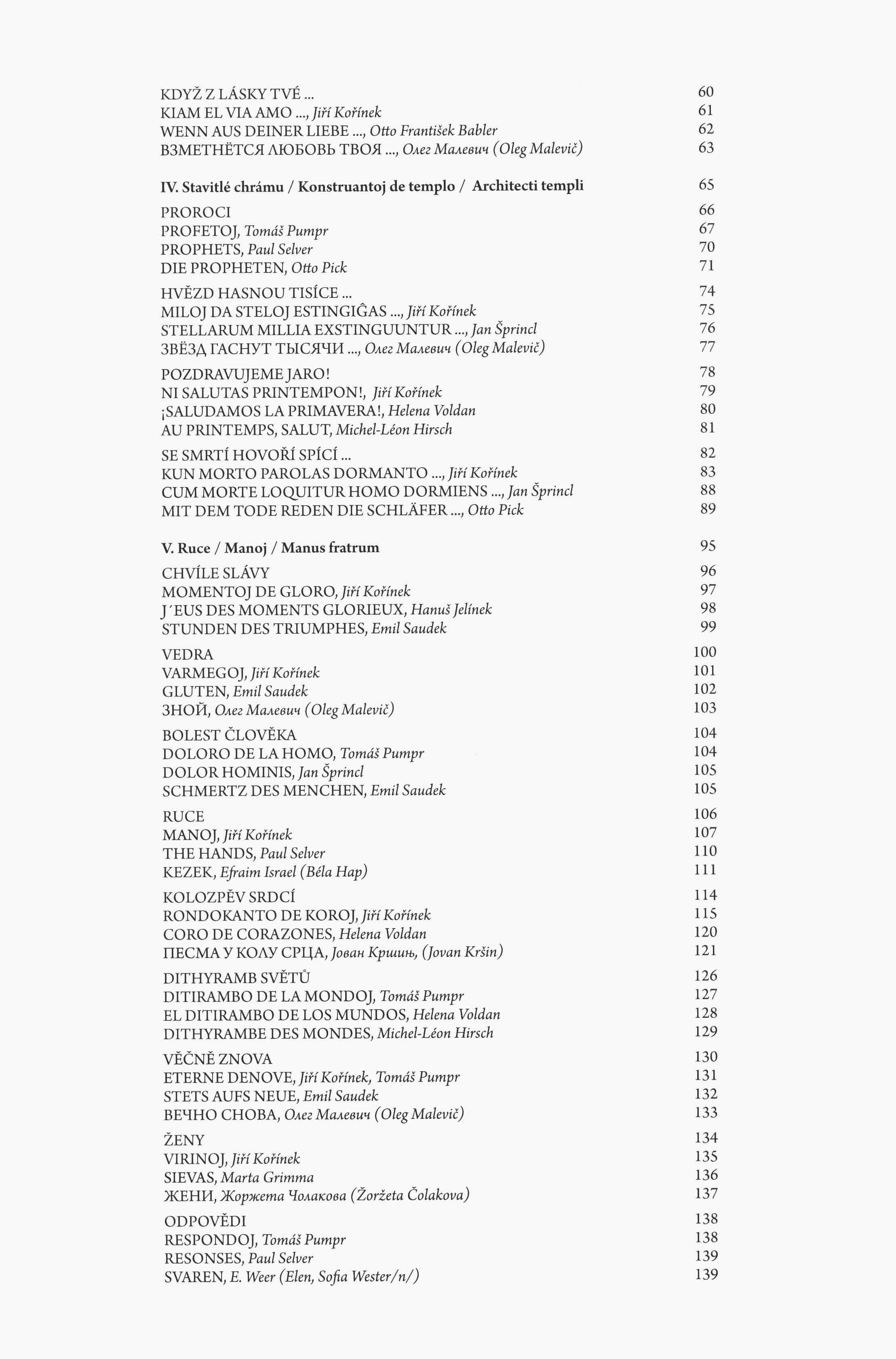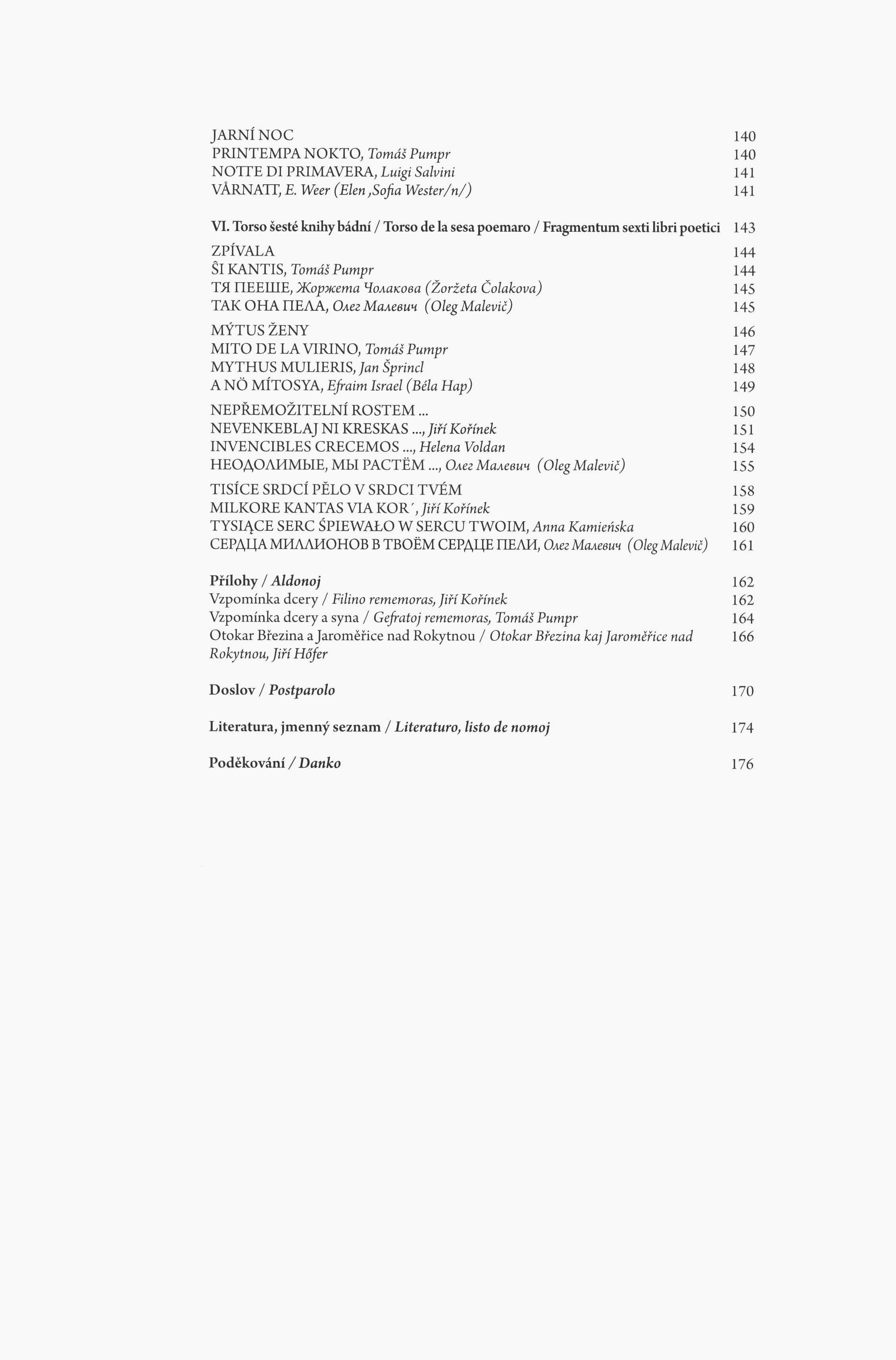Annotation Přibližně před padesáti lety sestavili Jiří Kořínek a Tomáš Pumpr antologii z básnického díla Otokara Březiny, do níž zařadili jeho jedenatřicet básní, které přetlumočili do esperantštiny. Tyto překlady však nebyly vydány knižně a brzy po svém dokončení putovaly do Březinova muzea v Jaroměřicích nad Rokytnou, kde jsou uschovány dodnes. Teprve v roce 2014, při příležitosti výročí Březinovy smrti, vznikla myšlenka publikovat tento výbor v knižní podobě, a to tím způsobem, že každá Březinova báseň tu zazní ještě v dalších dvou evropských jazycích. Kromě esperantštiny, do níž jsou převedeny všechny básně tohoto souboru, se tu Březina objevuje navíc v téměř dvaceti mutacích: v maďarštině, ruštině, latině, dále pak španělštině, rumunštině, slovenštině atd. Tato jazyková rozmanitost pouze potvrzuje, jak velkou osobností se Otokar Březina stal, a to nejen v kontextu dějin a vývoje české literatury. Výbor z poezie nejvýznamnějšího zástupce symbolistického proudu v české literatuře, který vznikl zhruba před půl stoletím zásluhou dvou esperantistů. Language note Básně jsou v češtině, souběžně v esperantu a dalších 18 jazycích; souběžný anglický, esperatnský a italský úvod. Document kind monografie Internal Bibliographies/Indexes Note Obsahuje bibliografii. Keywords česká poezie * výbor básní * překlady * esperanto * výbor z díla * Březina O. * sympozium * vícejazyčná vydání UDC (437.311) * 061.3 * =030 * 82-1 * 821.162.3 * 821.162.3-1 Uživatelské pole PNP Výbor vydán k 85. výročí úmrtí O. Březiny při příležitosti Mezinárodního sympozia "Březina 2014", konaného v Praze na FF UK v září 2014. Sign. Holman-Březina 337: Knihovna Petra Holmana. - Intaktní výtisk. Call number Track No. Location Info C12d 2102 0328/2016 Sbírka Holman-Březina 0337 1251/2023 Sbírka
