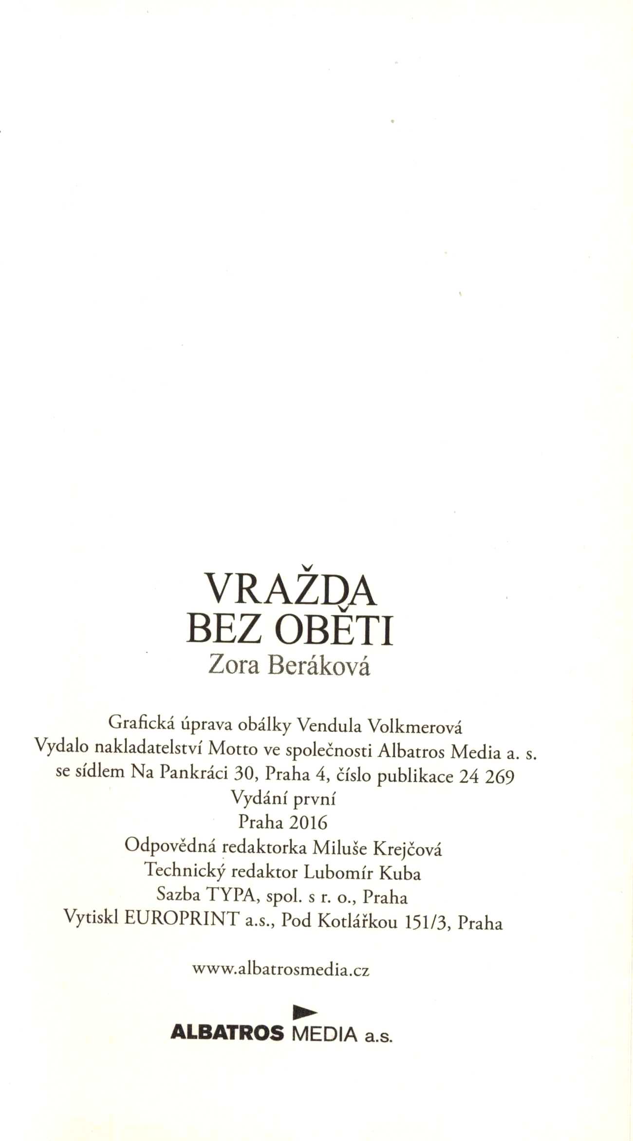 Title information Vražda bez oběti : detektivní povídky / Zora Beráková ; grafická úprava obálky Vendula Volkmerová Personal name Beráková, Zora, 1921-2020 (Author) Další autoři Volkmerová, Vendula, 1976- (Book designer) (Bookjacket designer) Edition statement Vydání první Publication Praha : Motto, 2016 Manufacture Praha : EUROPRINT, a.s. Scope 338 stran ; 22 cm ISBN 978-80-267-0657-1 (vázáno) Country Czech Republic Language Czech Note Zdobená barevná vazba. - Nakladatelská značka na vakátě. - Obsah. - Na zadní straně vazby anotace knihy a bio-bibliografická poznámka o autorce.