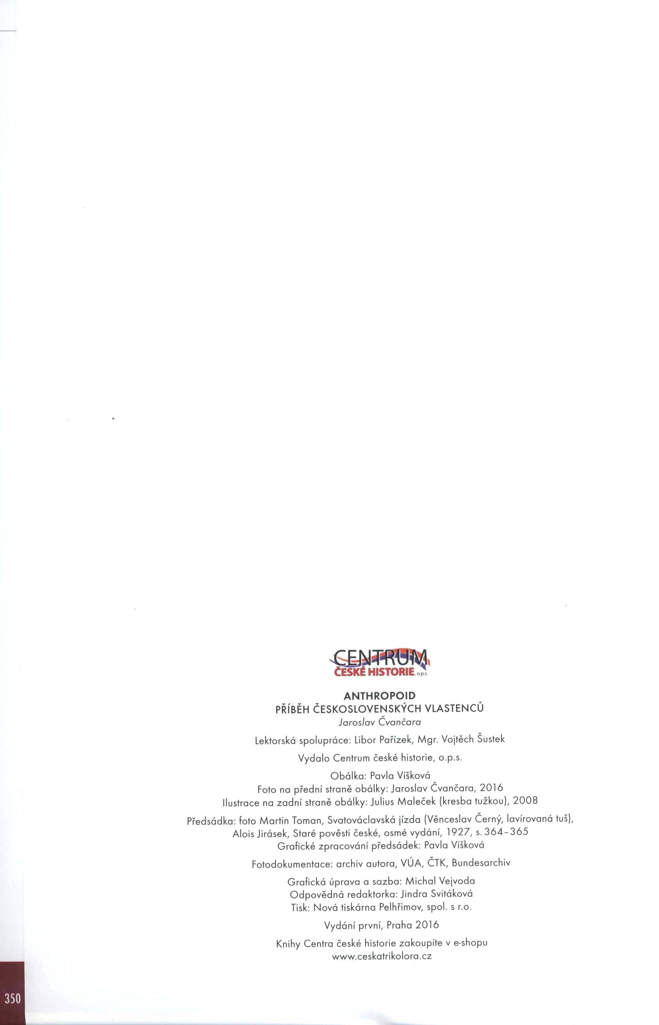 Title information Anthropoid : příběh československých vlastenců / Jaroslav Čvančara ; obálka: Pavla Víšková ; grafická úprava a sazba: Michal Vejvoda Personal name Čvančara, Jaroslav, 1948- (Author) (Photographer) Další autoři Víšková, Pavla (Bookjacket designer) Vejvoda, Michal (Book designer) (Compositor) Corporation Centrum české historie o.p.s. (společnost) (Publisher) Nová tiskárna Pelhřimov (tiskárna) (Printer) Edition statement Vydání první Publication Praha : Centrum české historie, o.p.s., 2016 Manufacture Pelhřimov : Nová tiskárna Pelhřimov, spol. s r.o. Scope 350 stran : ilustrace (některé barevné), portréty, faksimile, erby ; 31 cm ISBN 978-80-88162-08-7 (vázáno) Country Czech Republic Language Czech Note Vazba s barevnými fotografiemi a s dvoubarevným textem. - Předsádky zdobené černobíllými ilustracemi. - Dvoubarevný text a nakladatelská značka na titulním listu. - Věnování. - Černobílé a barevné ilustrace, obrazy, fotografie, znaky, faksimile, erby s popisky. - Terminologický slovník. - Seznam výsadků z Velké Británie do Protektorátu. - Poděkování. - Loga sponzorů. - Inzerce. - Obsah. - Nakladatelská značka v tiráži. - Anotace knihy, ilustrace a nakladatelská značka na zadní straně barevné vazby.