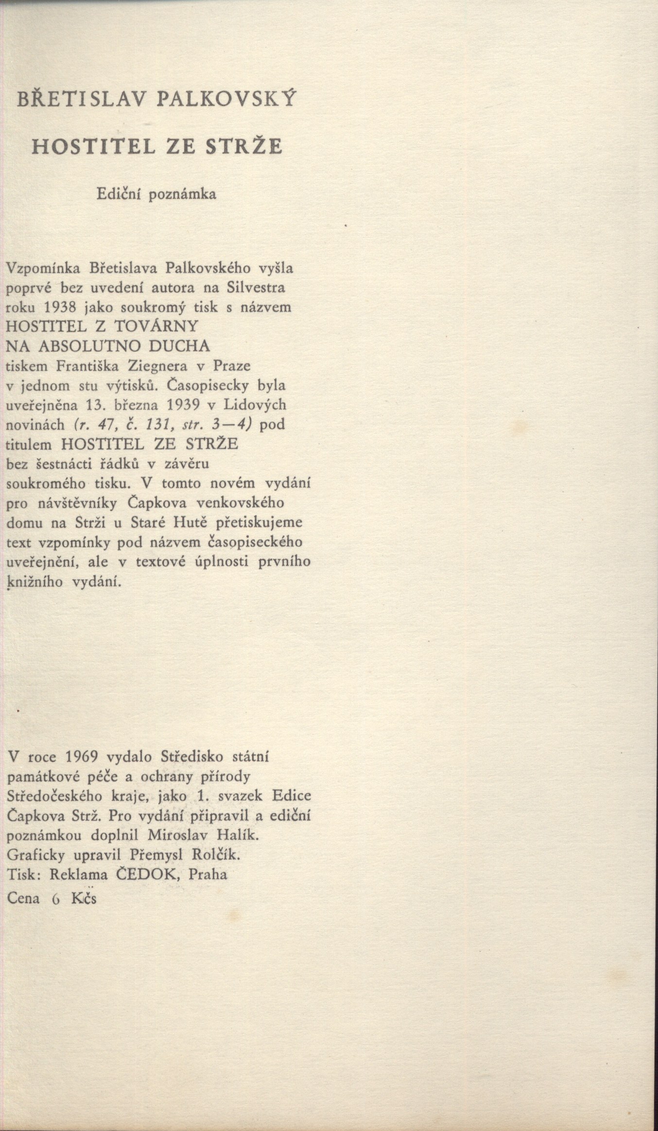 "Vzpomínka Břetislava Palkovského vyšla poprvé bez uvedení autora na Silvestra roku 1938 jako soukromý tisk s názvem Hostitel z továrny na absolutno ducha ..."--Tiráž